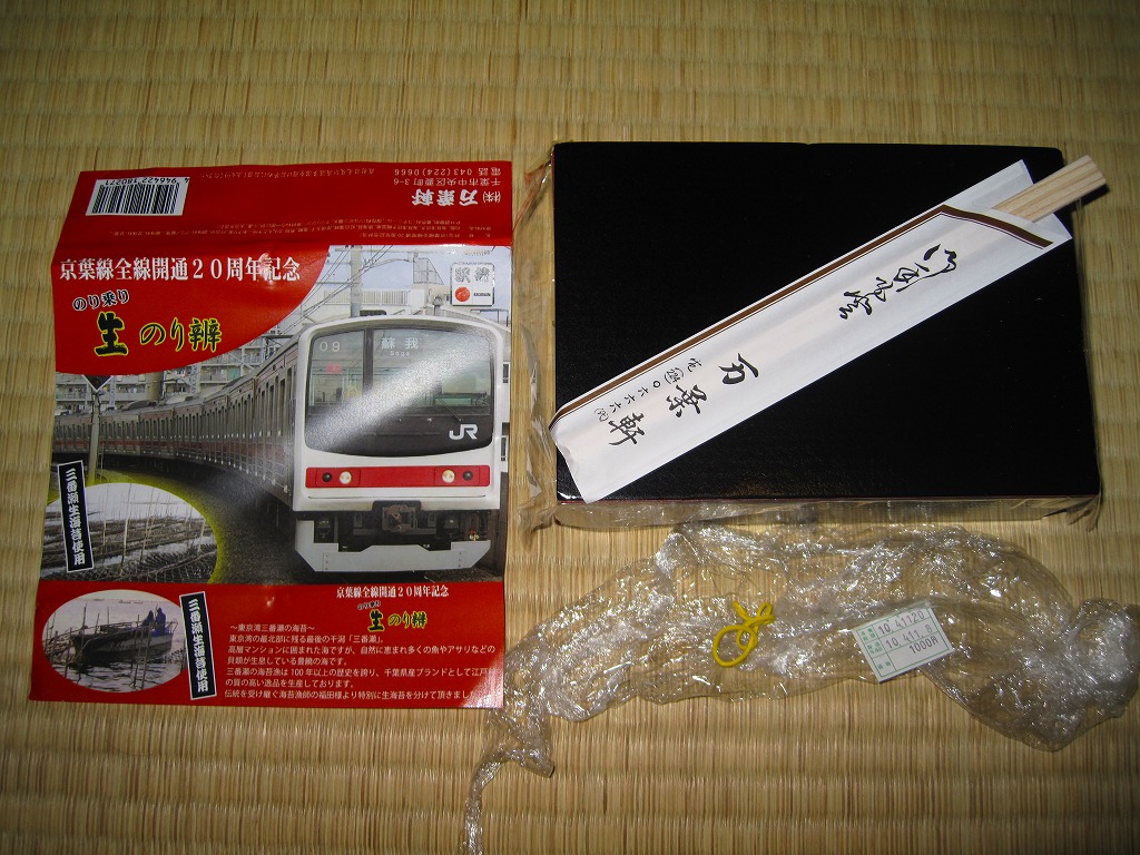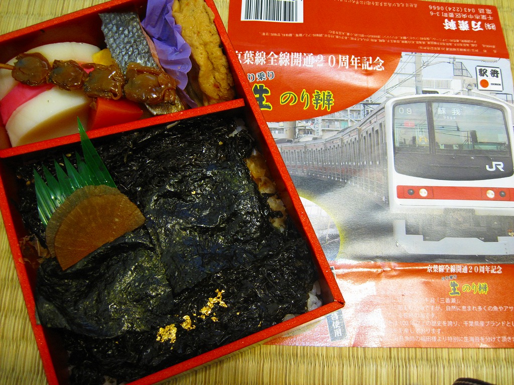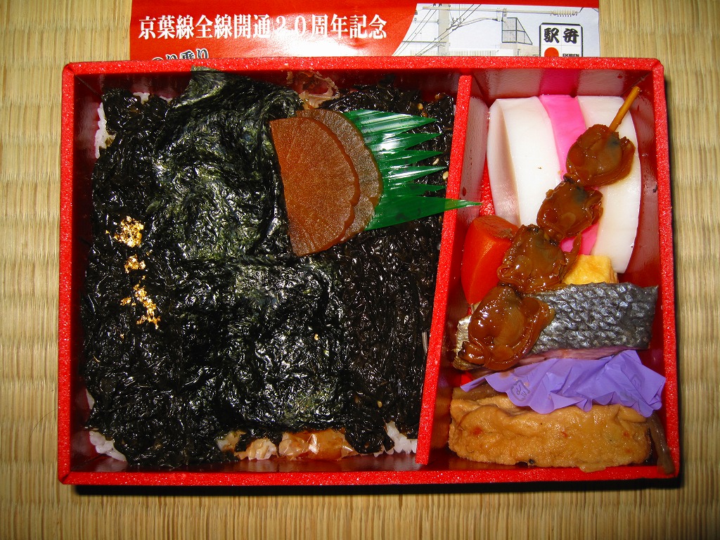 JR京葉線の全線開通20周年を記念して、2010(平成22)年3月10日から4月頃まで販売された記念駅弁。こうやって東京駅の第11回東日本縦断駅弁大会でも販売された。黒塗りの容器に、京葉線の通勤電車の写真を載せた赤い掛紙を巻き、ラップで包む。中身は白御飯の上に鰹節をまぶし、三番瀬で獲れたという海苔を浅炊き、浅炊き韓国風、焼海苔の3種で覆い、アサリ串、熱い紅白のカマボコ、玉子焼、鮭塩焼、がんもどき、タクアンなどを添えるもの。