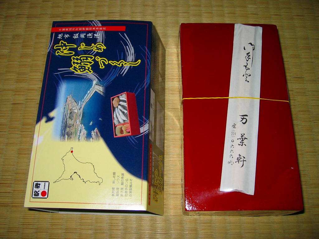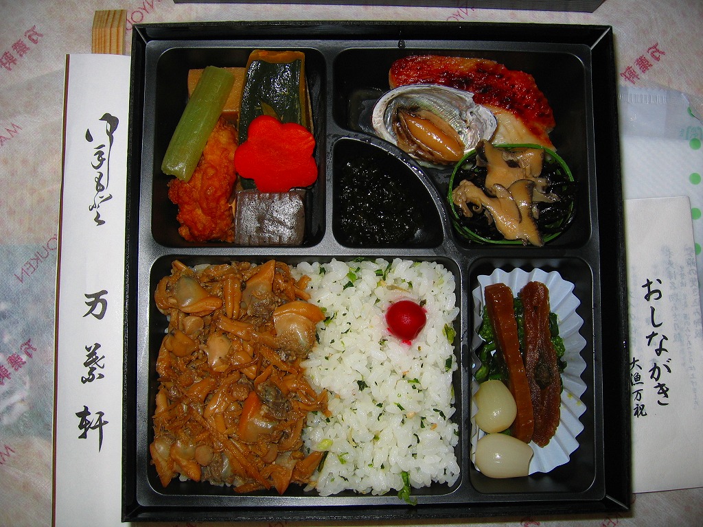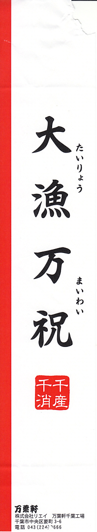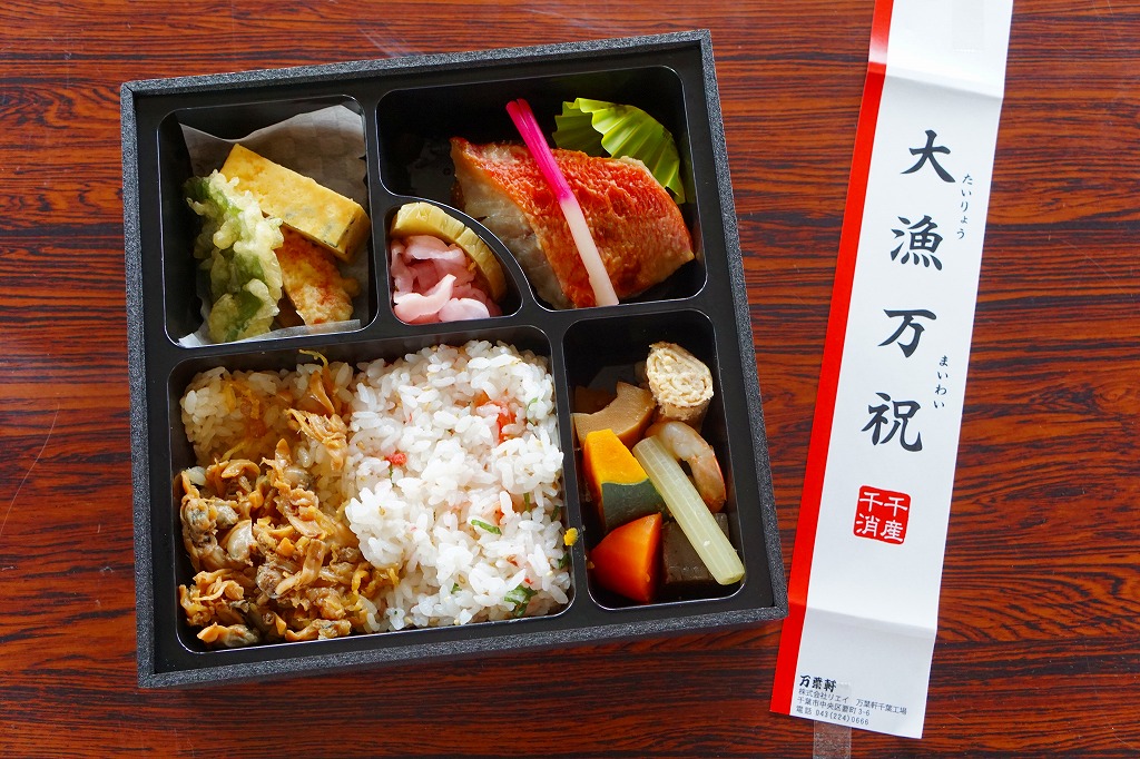 珍しく1業者で2種類も出す、千葉駅版の「大人の休日」駅弁のもうひとつ。木製のような触感と強度があるボール紙製のフタ付き長方形の容器に、柄はともかく印刷はインクジェットプリンタのちょっとチープな掛紙を貼り、和紙風の風呂敷で包んで高級感を出す。中身はアサリ御飯と高菜の日の丸御飯、鯛の佐倉味噌焼、トコブシやサザエやヒジキ、カボチャやタケノコなどの煮物など。趣味的には掛紙の改善により、容器や包装や内容や風味で演じる高級感がより生きると思う。価格は2005年の購入時で1,200円、2015年時点で1,300円、後に1,500円、2019年10月から1,600円。2017年時点で下記のとおり、接頭辞を外した「大漁万祝」として、エキナカで売られていた模様。2020年の春頃までに、ひっそりと終売か。