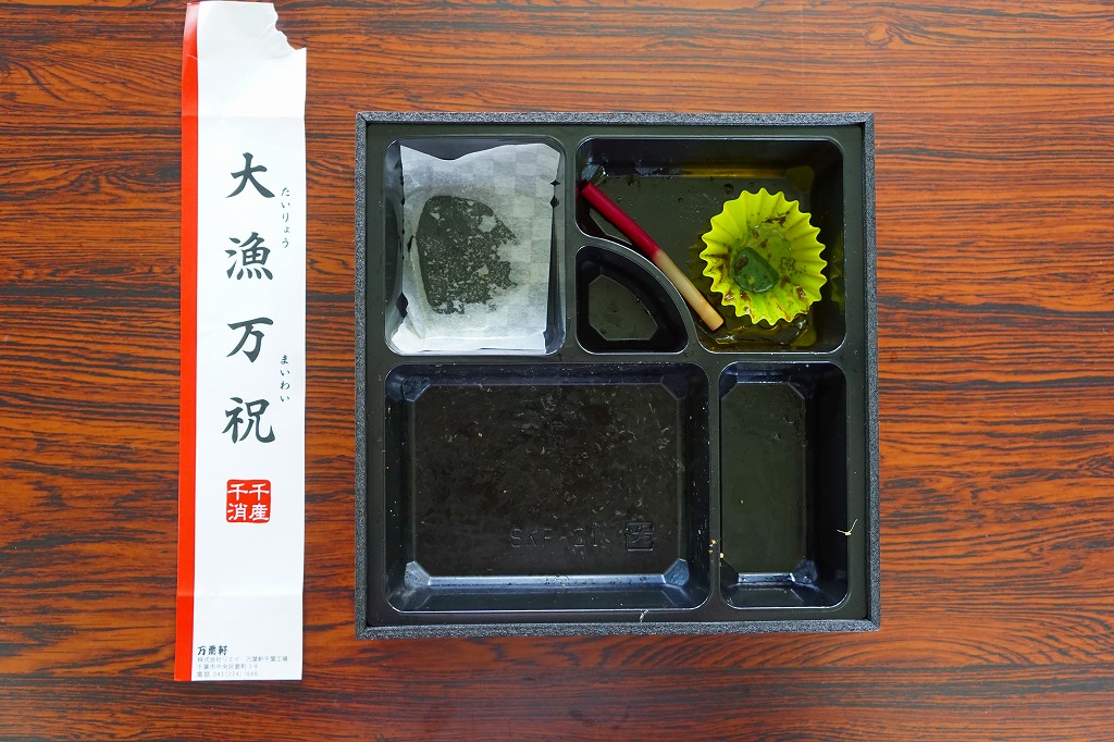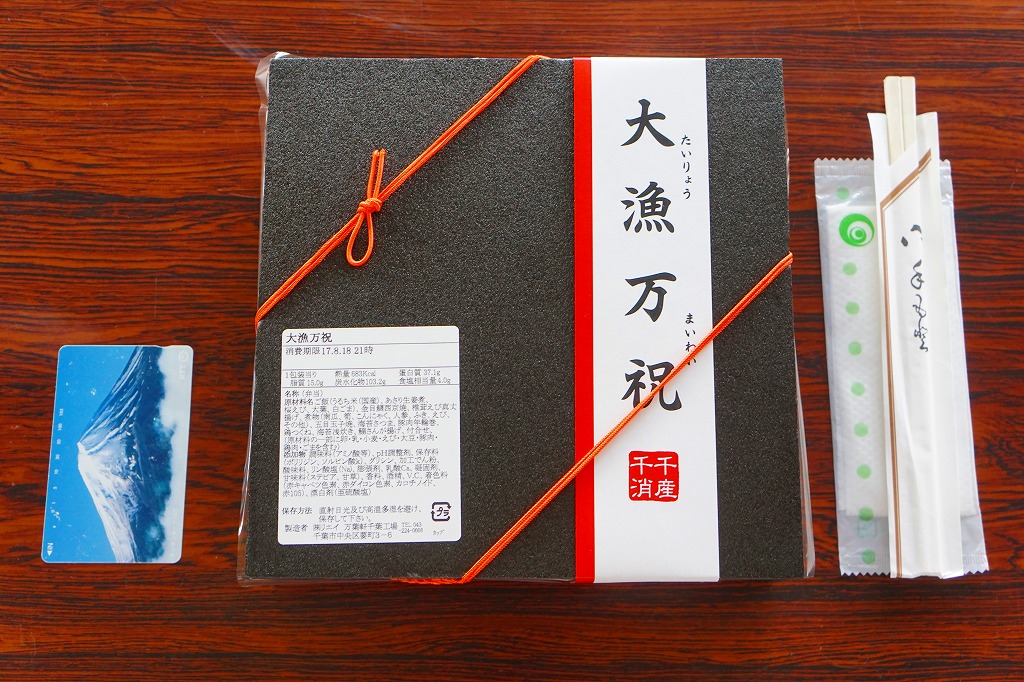 上記の駅弁「大人の休日 大漁万祝」の、2017年時点での姿。JR東日本各地の大人の休日駅弁は自然消滅し、この弁当も駅で見ることはなくなったが、調製元のカタログには載っており、こうやって数をまとめて事前の注文により購入できた。この年には、千葉駅の駅弁売店でなく、千葉駅の駅ビルに入居した調製元の売り場で売られていたとの報告もある。