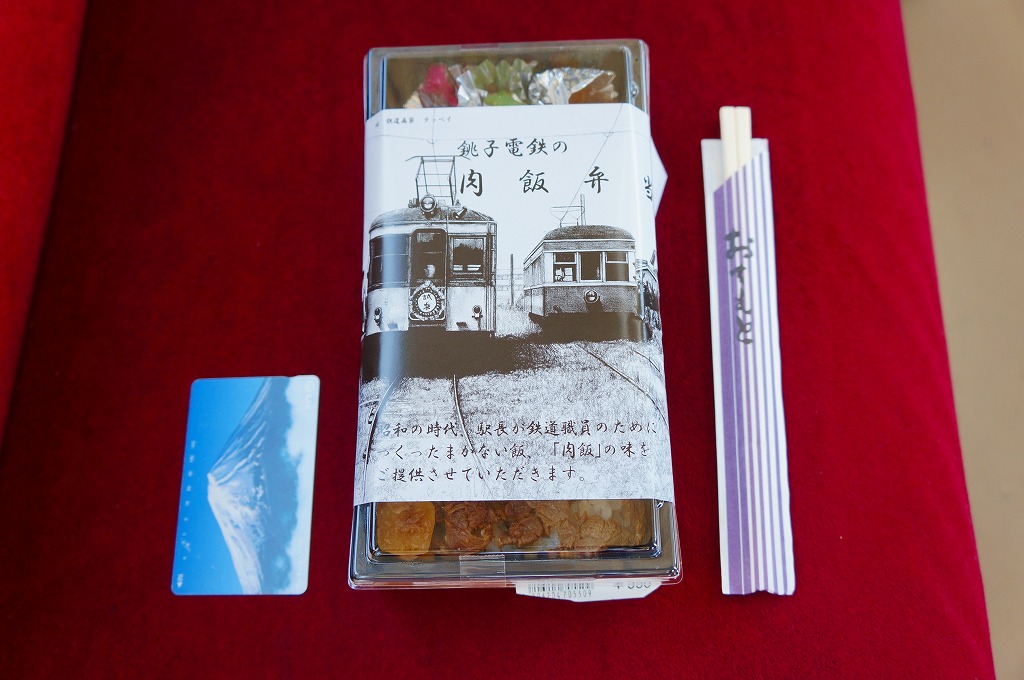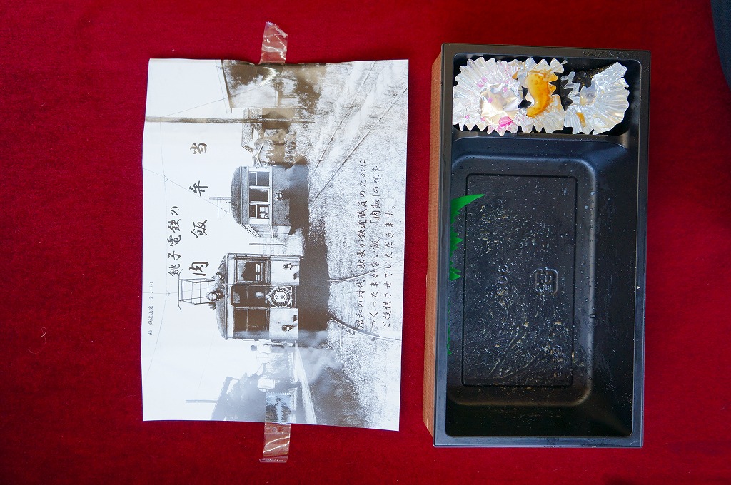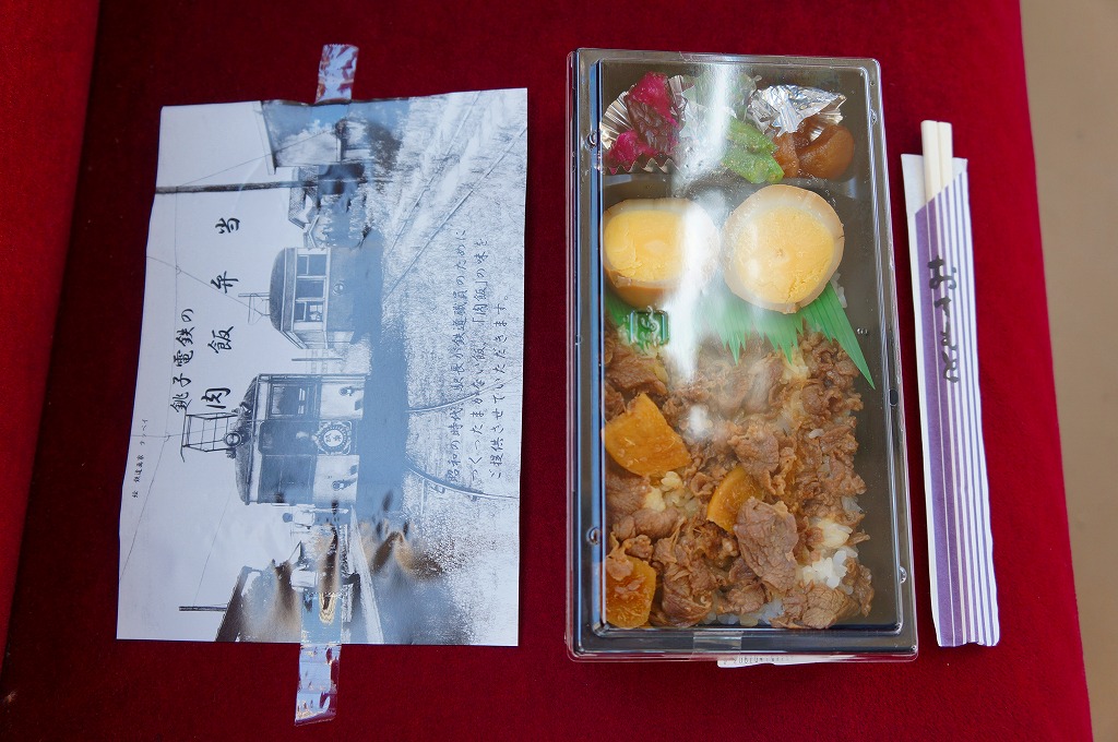 各地の駅弁でもおなじみの長方形のプラ製容器に、白御飯を詰め、甘めの牛肉煮をぶちまけて、半身の煮玉子をふたつ置き、インゲンや柴漬けなどの付合せを添える。出自からしてグルメではない、ジャンクフードかB級グルメのたぐいであるが、その線ではよくできた味。車内での駅弁がいらないローカル線で、そして駅弁屋が定着しなかった銚子で、こうして販売が継続されているのも、観光客向けをコンセプトになんでもまるごと詰め込んで浮ついた味ではなく、地に足を付けたことが功を奏しているのではないかと思う。