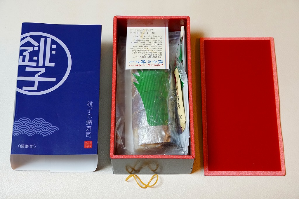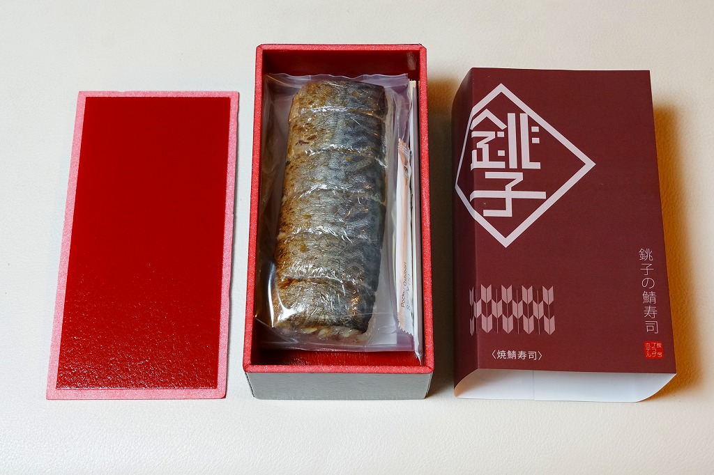 上記の商品「銚子の鯖寿司」の、焼きサバ寿司バージョン。青い包装紙が焼き色ないし醤油色になり、酢飯に丸々とした焼きサバを合わせる。ほどほどの脂の乗りと柔らかさが印象的。価格は2019年時点で1,080円、2023年時点で1,200円、10月までに1,500円、2025年時点で1,900円。