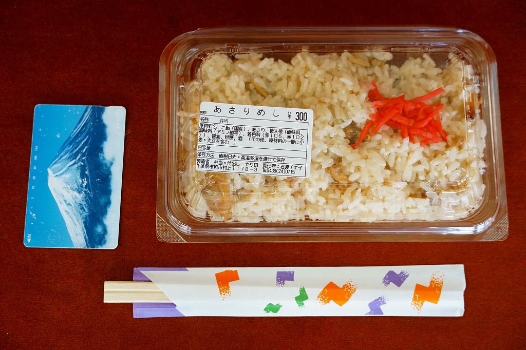 小湊鐵道の五井駅弁で最も知られた存在だと思う。中身はあさりめし。味もあさりめし。見た目はお惣菜。五井駅弁の販売形態そのものが、駅の通路に置かれた簡易な惣菜店。値段も駅弁のそれでなく、惣菜にしても安価。これが地元や旅客に支持されて、この時点で20年かそれ以上、同じ姿で売られている。調製元の閉店により、2025年10月30日限りで終売となった。