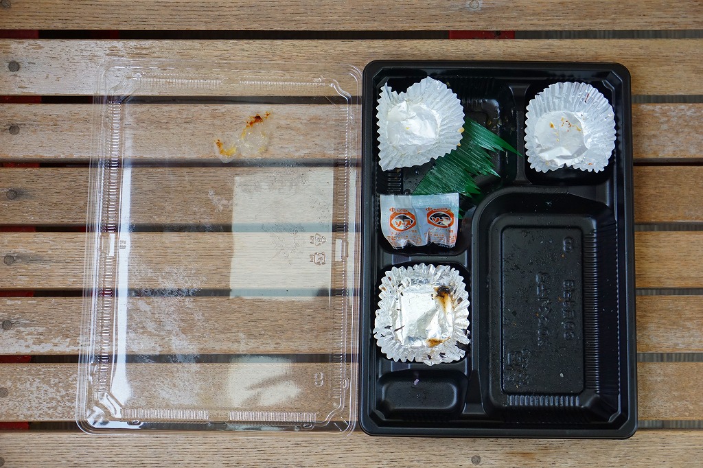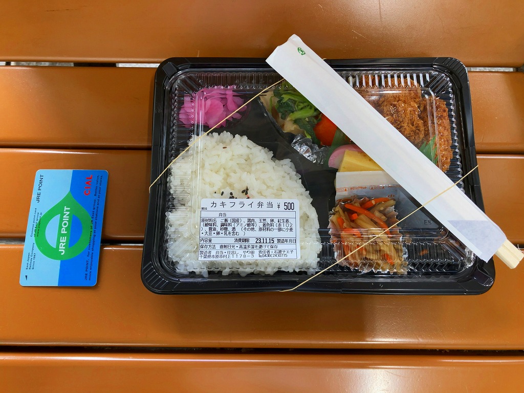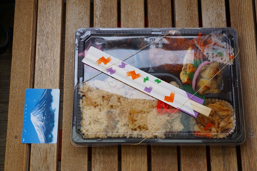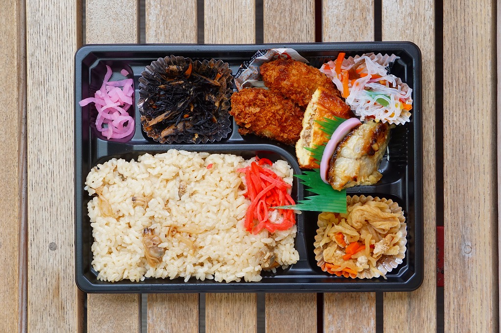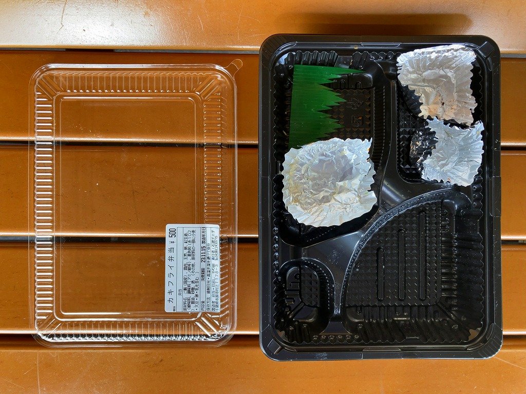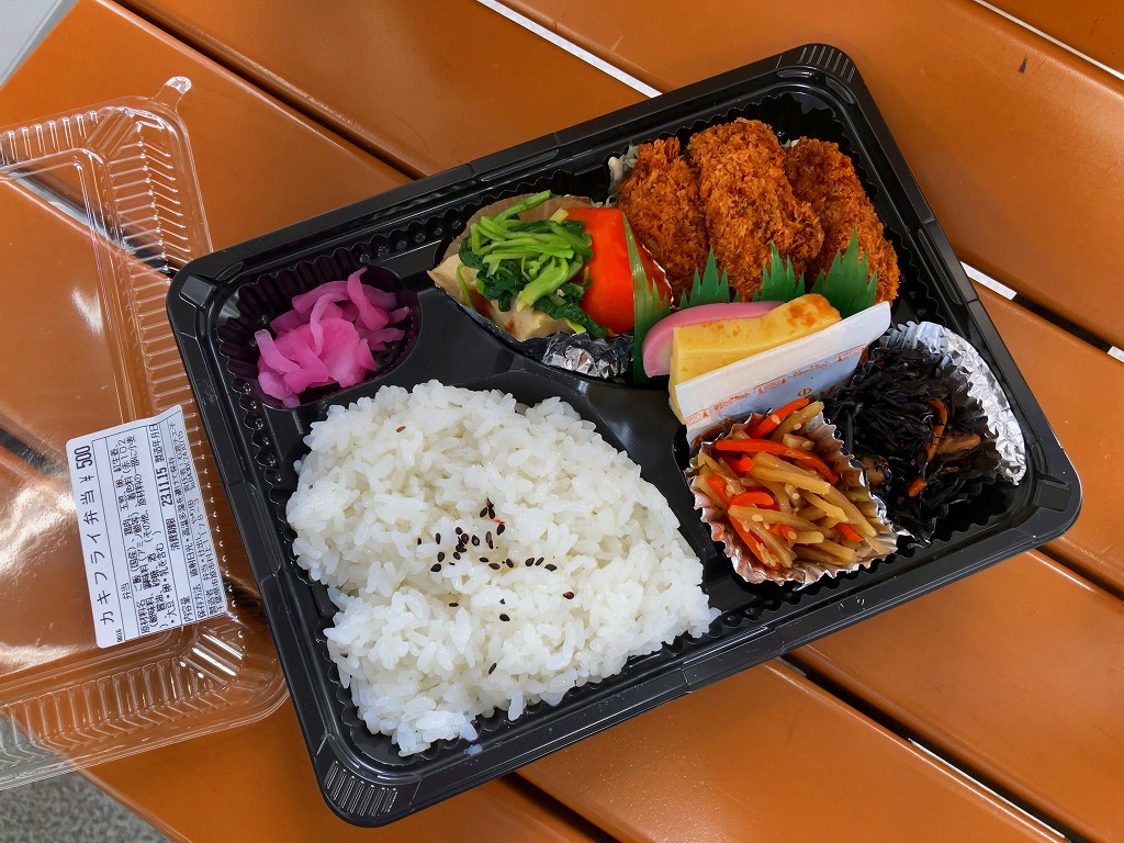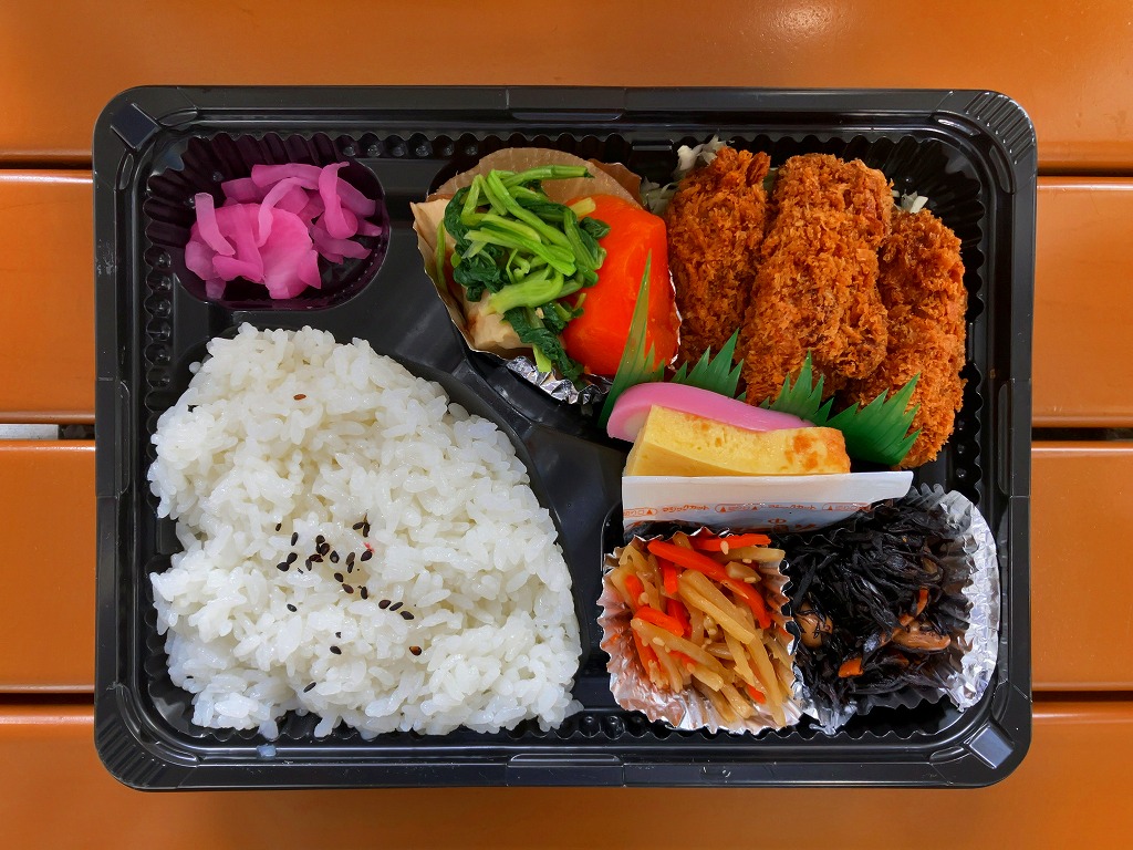 五井駅で買えたお弁当。平たいプラ容器に、白飯、カキフライ3個、キャベツ千切り、ダイコンやニンジンなどの煮物、ひじき煮、きんぴらごぼう、玉子焼、かまぼこ、大根桜漬を詰めた惣菜弁当。上記の「あさりめし」などの五井駅弁と同じ姿をして同じ場所で売られるが、このカキフライ弁当が駅弁と紹介されたことはないと思う。実は千葉県でも牡蠣が獲れるが、それとこれの関係も分からない。今回の訪問では朝10時に訪れたのに、商品がこれと惣菜の1点ずつしかなく、五井駅弁の先行きに不安を覚えた。鉄道会社のホームページでの駅弁の紹介もなくなってしまった。調製元の閉店により、2025年10月30日限りで終売となった。