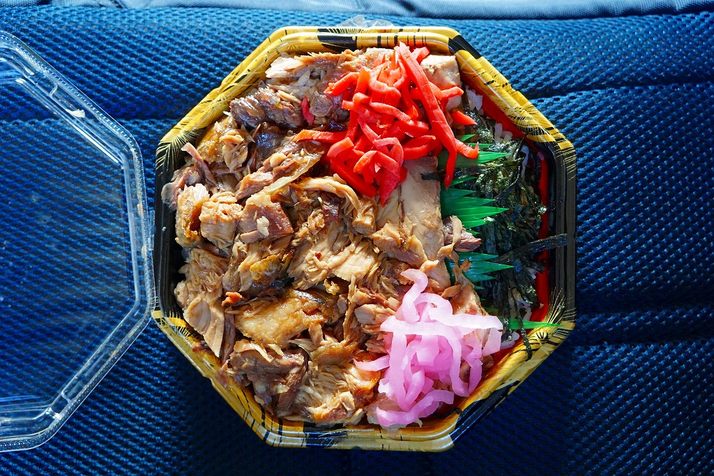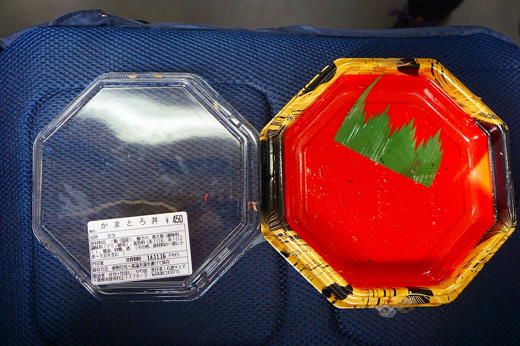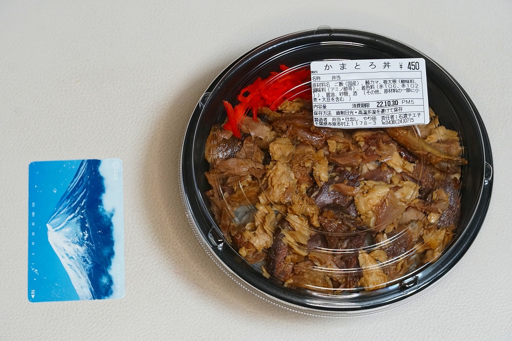 上記の駅弁「かまとろ丼」の、2014(平成26)年時点での姿。容器はおそらく決まっていないのではと思う。白飯をマグロのカマで覆い、紅生姜と刻み海苔と桜大根を添えていた。うまい味は変わらなくても、見栄えでは2022年のものが良い感じ。