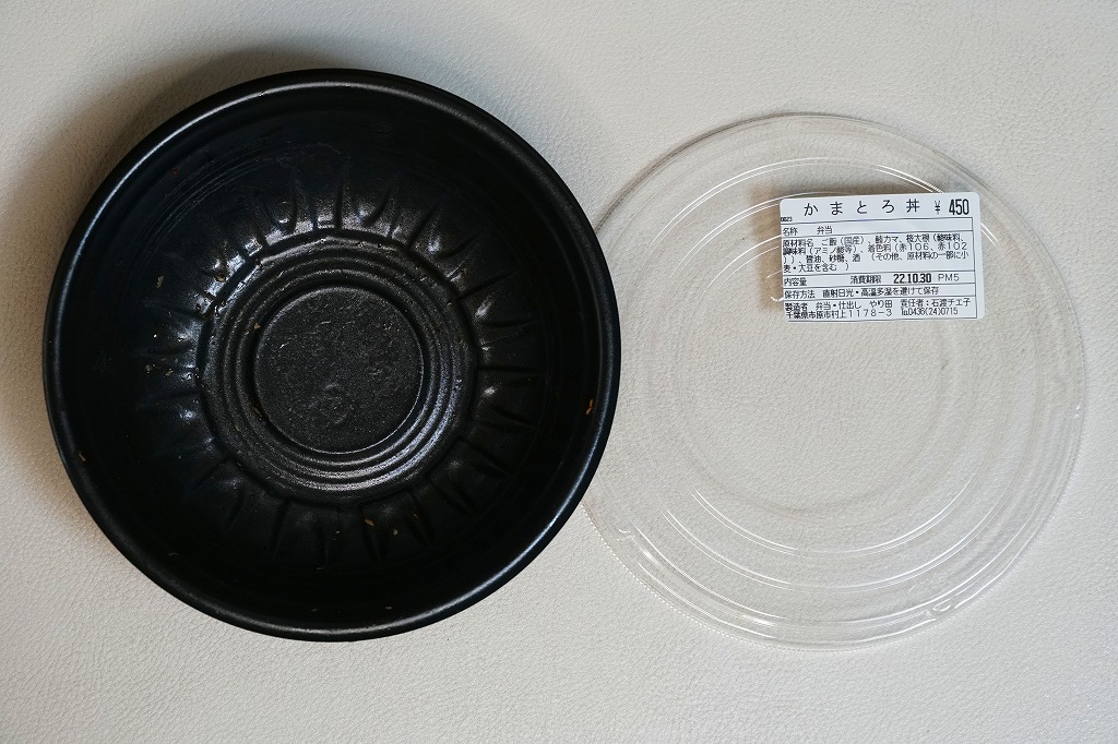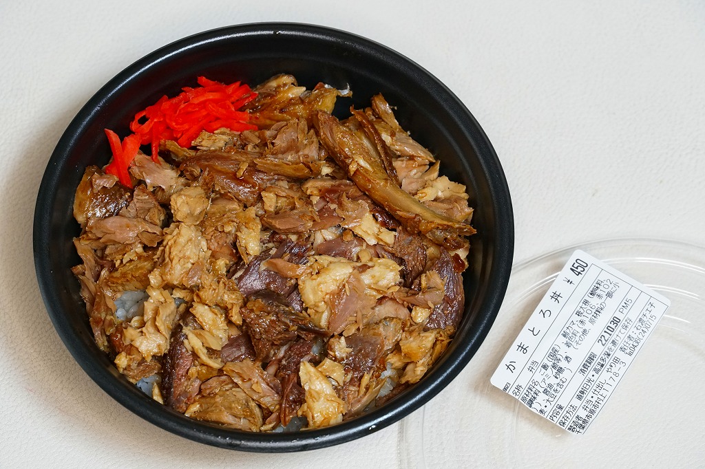 五井駅で小湊鐵道が駅弁と紹介した惣菜のひとつ。円形の容器に白飯を詰め、マグロのカマで覆い、紅生姜を添える。姿は駅弁というよりは惣菜で、うまそうな見栄え。駅弁ではまずお目にかかれない部位は脂が乗り、味ではどんな魚駅弁にも負けない、デリシャスなお魚丼。調製元の閉店により、2025年10月30日限りで終売となった。