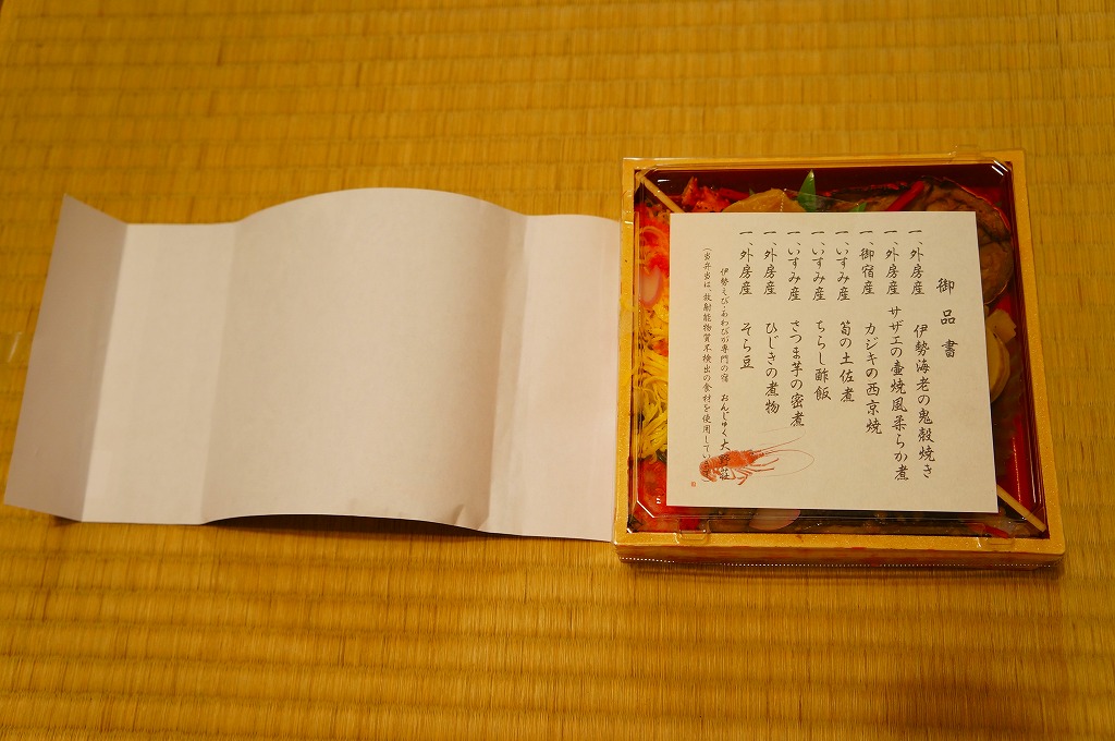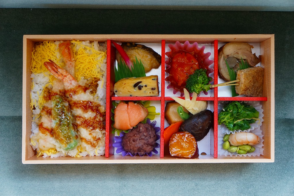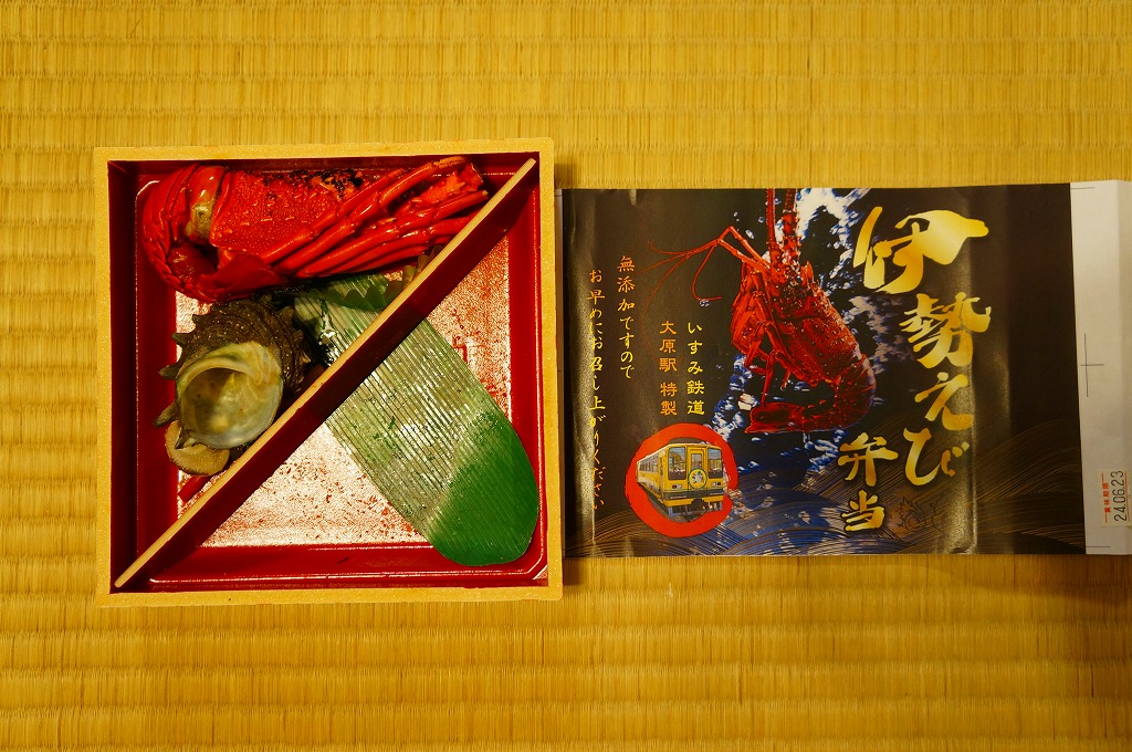 柔らかな正方形の容器を、跳ねるイセエビにいすみ鉄道の車両を添えた絵柄の黒い掛紙を巻く。中身は半分が御飯でヒジキやソラマメや錦糸卵などを使うちらしずし、半分がおかずでカジキ西京焼、サザエ壷焼、半身のイセエビの調製元自慢の鬼殻焼。外房の食材で固めている。