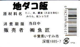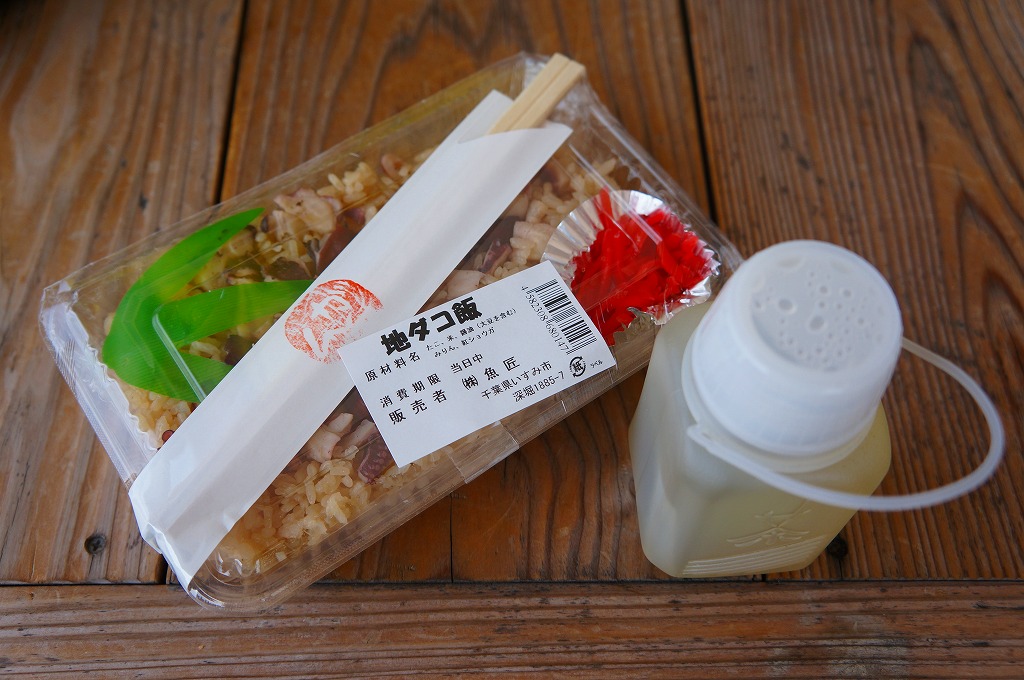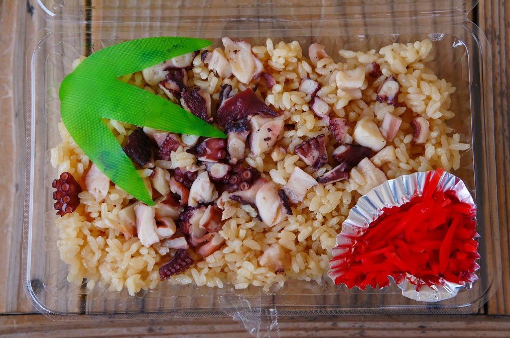 2011(平成23)年までに発売か。屋台向けなヘナヘナの透明プラ製容器にタコの炊込飯を詰めて紅生姜を添える。見た目はただの惣菜だが、食べてみれば身の締まるタコのそぼろが茶飯にぎっしり混ざる、良質なB級グルメ。駅弁の容器を与えて添え物をして500円という姿を見たいと思った。調製元は大原港の干物屋さん。なお、写真のポリ茶瓶(ポリ容器入りのお茶)は別売り。