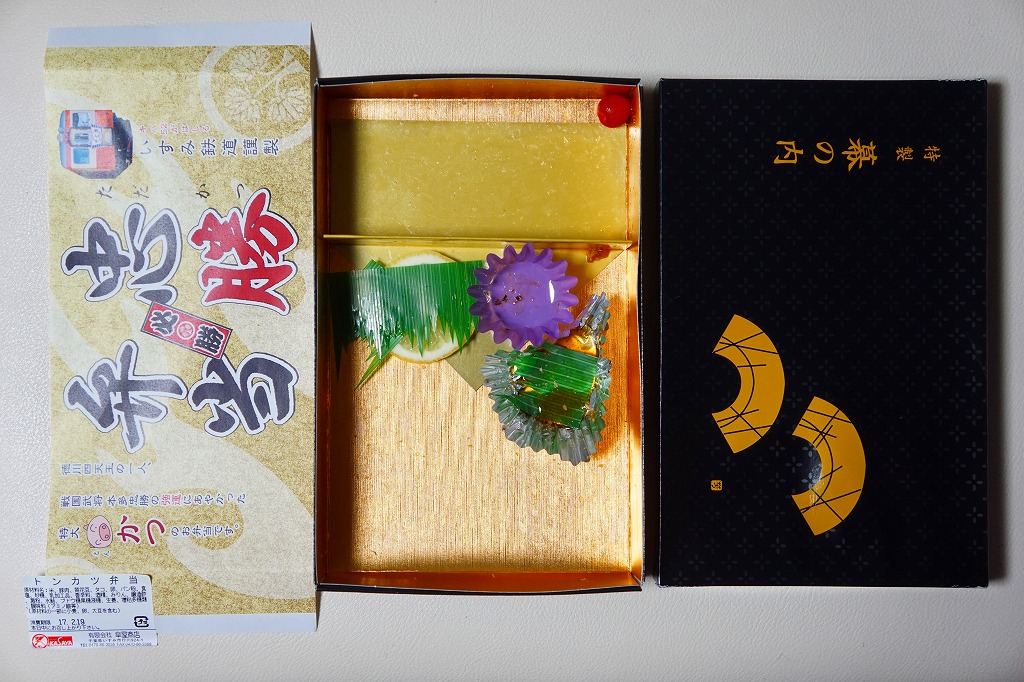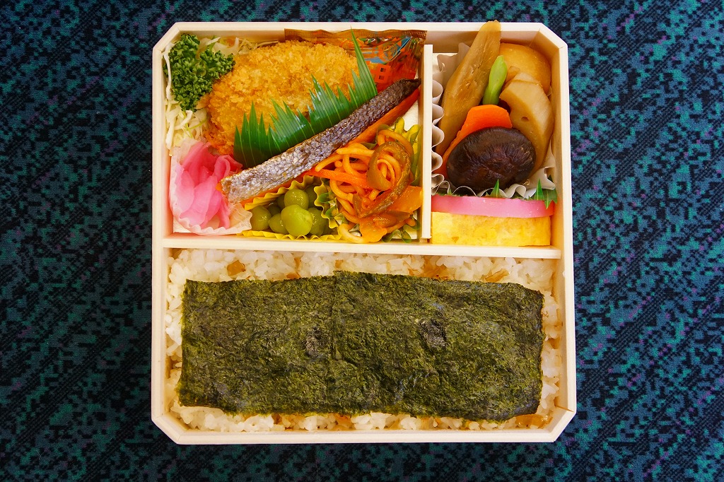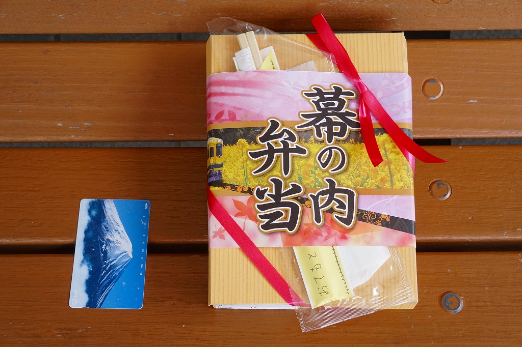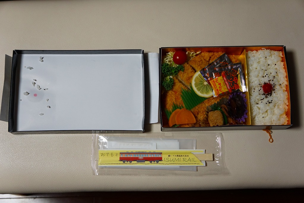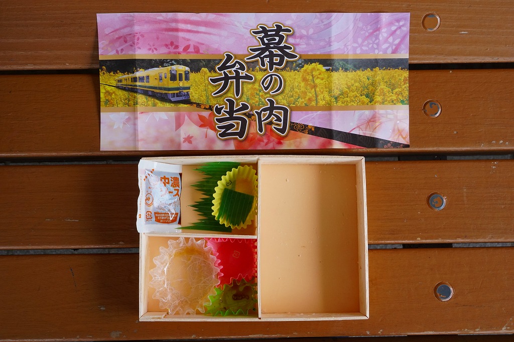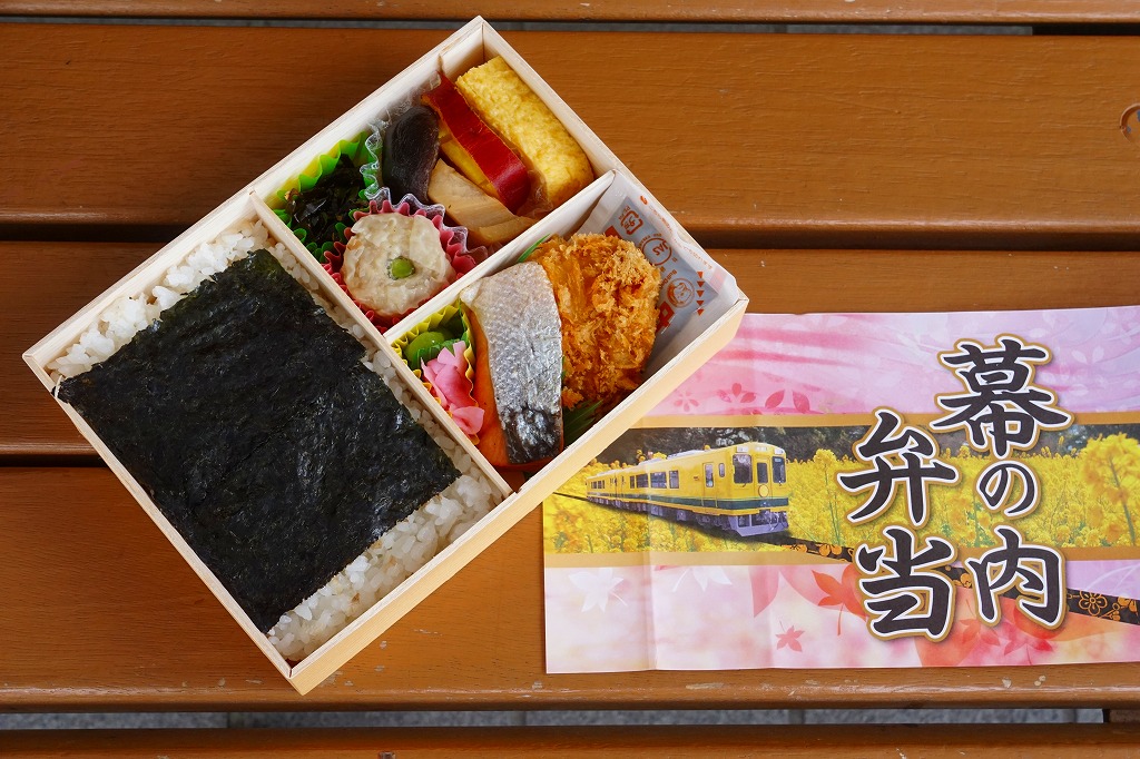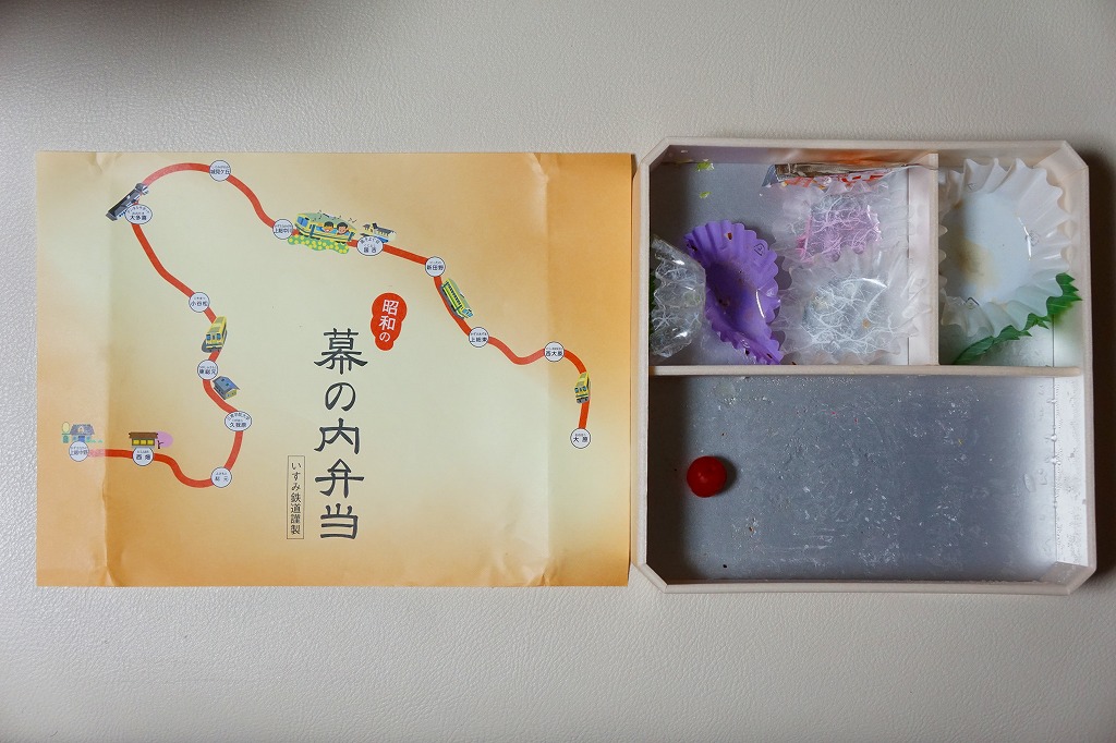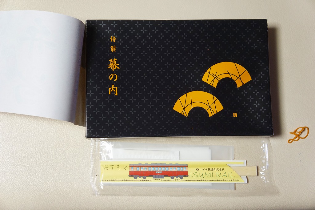 掛紙には、駅弁の名前と、いすみ鉄道の路線図を、シンプルに描く。中身は日の丸俵飯に、焼き魚(サケ)、かまぼこ、玉子焼の幕の内駅弁三種の神器、シイタケやレンコンなどの煮物、コロッケ、焼売、煮豆、大根桜漬など。たしかにこれは、昭和時代の国鉄駅の幕の内弁当。とてもきれいにつくられている。写真にないが、これもやはり昭和時代の国鉄駅で駅弁とともに売られていた、ポリ茶瓶がひとつついてきた。土休日のみの販売、予約を推奨。予約先は調製元でなく、いすみ鉄道(0470(82)2161)となる。2017(平成29)年7月に、上記の「幕の内弁当」へリニューアル。