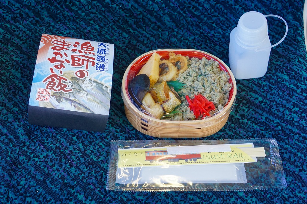 2011(平成23)年9月3日に発売。2010年3月の国吉駅「里山弁当」、2011年4月の大原駅「忠勝弁当」に次ぐ、いすみ鉄道で3番目の駅弁。調製元はイセエビとアワビが専門という御宿の旅館。原則は2日前まで2個以上の電話予約での土休日の販売であるが、この日はたまたま売店に置かれていた。