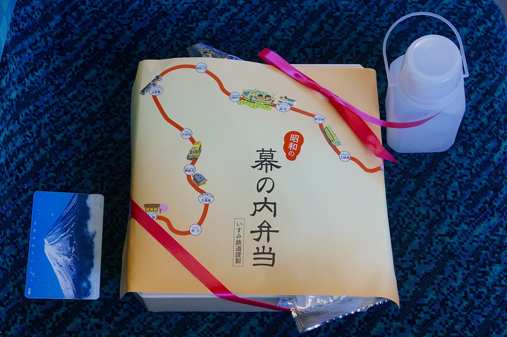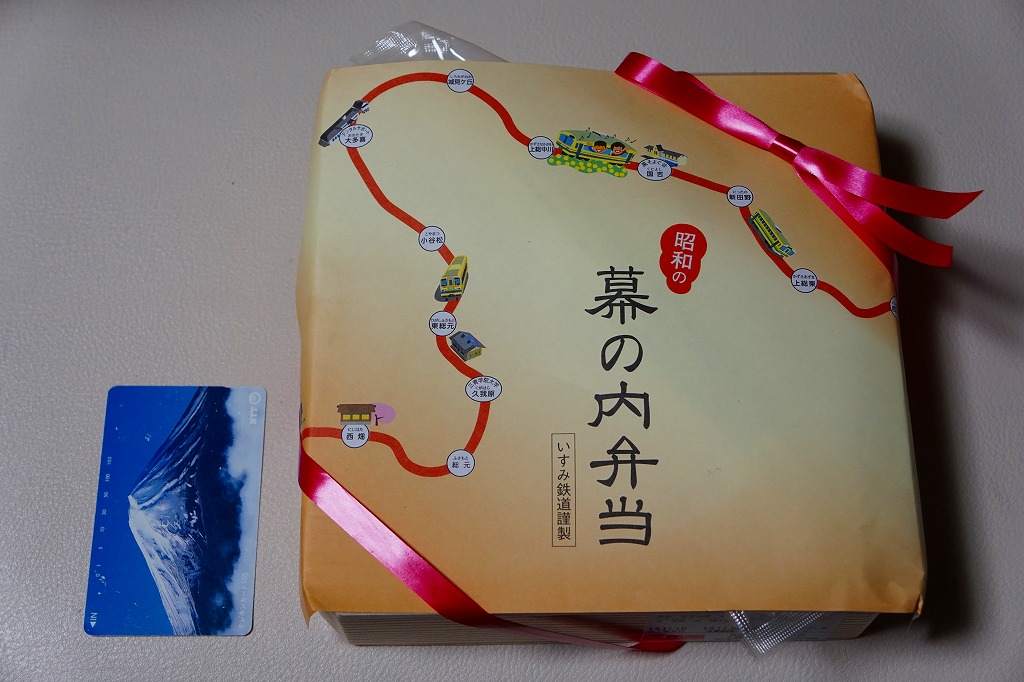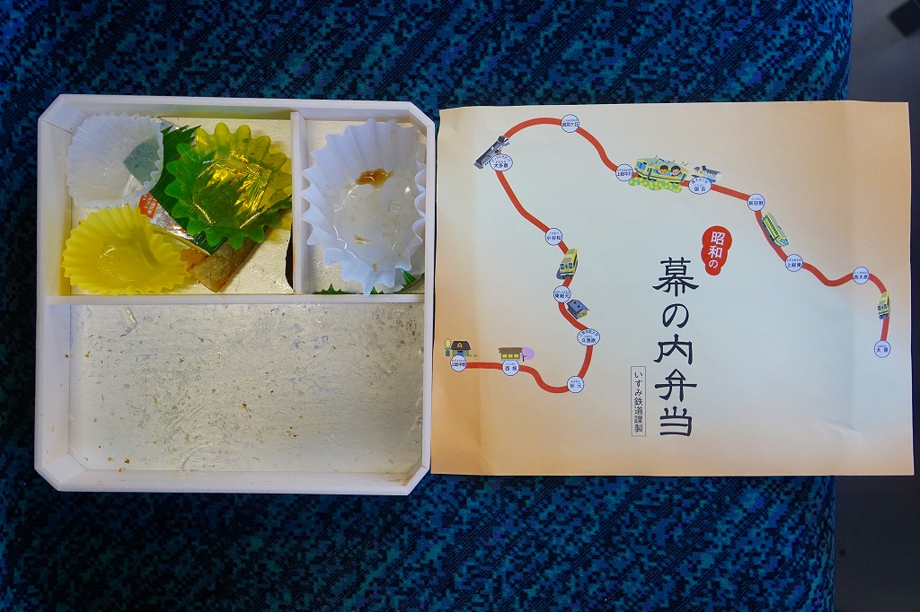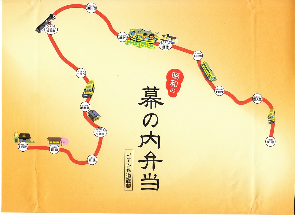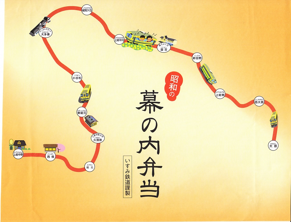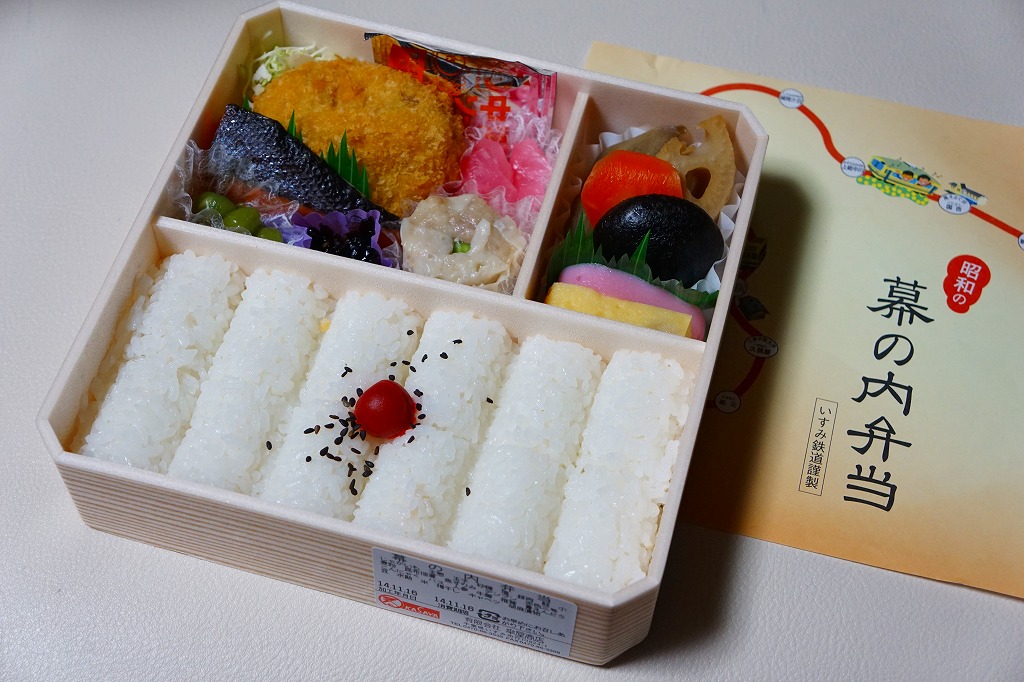 2014(平成26)年7月5日の発売。同駅のタコ飯弁当が6月から9月まで販売できないことと、大原駅の駅弁は国鉄時代の駅弁の定義でいう特殊弁当しかないことで、いすみ鉄道が駅弁屋に昭和の幕の内弁当の制作を依頼したという。そのモデルは、肥薩線吉松駅の幕の内駅弁だという。