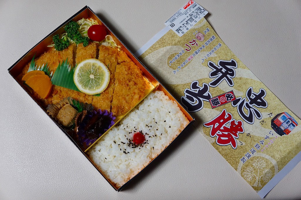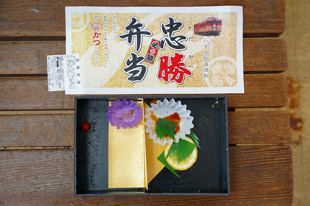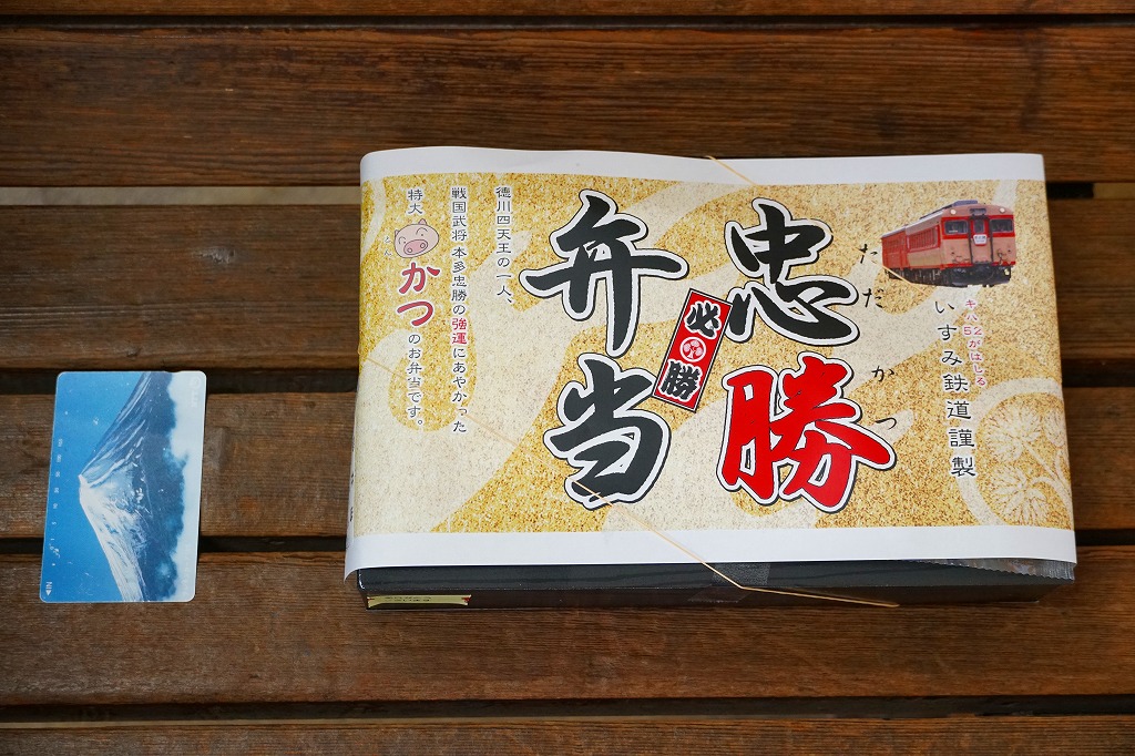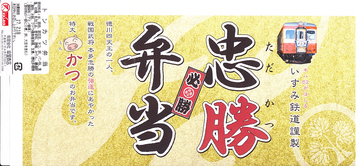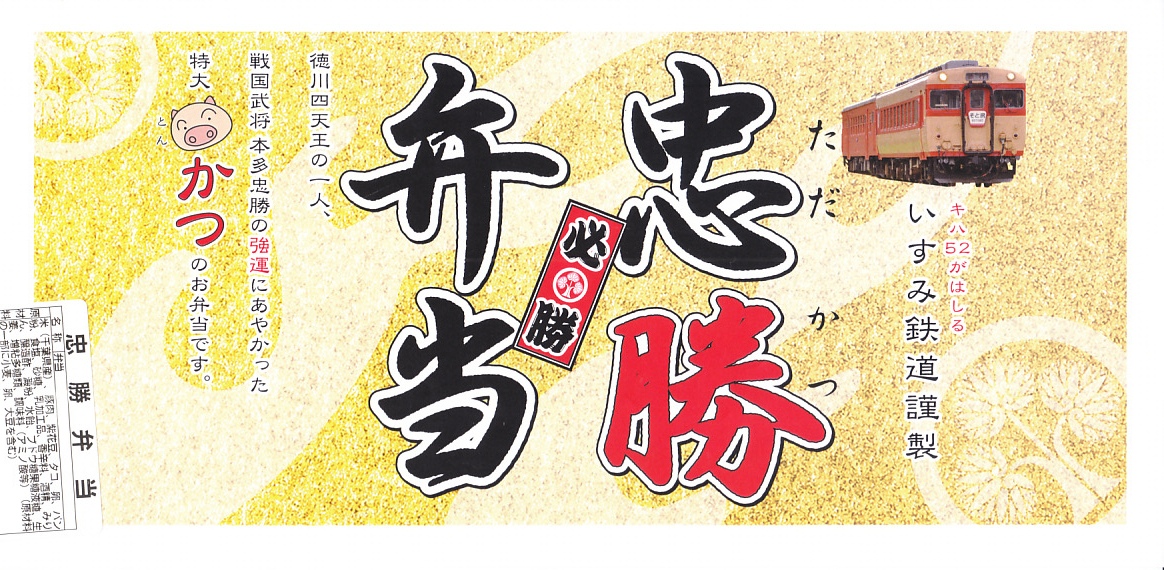 2011(平成23)年4月に発売か。「里山弁当」に続く、いすみ鉄道の駅弁の第2弾。駅弁の名前は戦国武将で大多喜藩10万石の初代藩主である本多忠勝にちなみ、駅弁の中身はその名にちなんだトンカツ弁当。中身は日の丸御飯とトンカツ1枚とキャベツ千切りに、タコ、花豆、たくあん、プチトマト、パセリを添えたもの。つまりシンプルなトンカツ弁当。大きく適度に柔らかく、衣がサクサクの良いトンカツが印象的。単に食べるだけでも、おいしいお弁当。