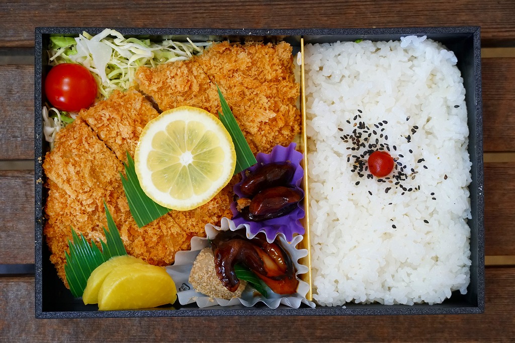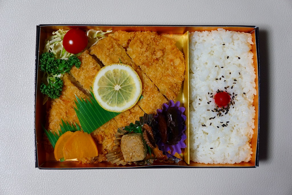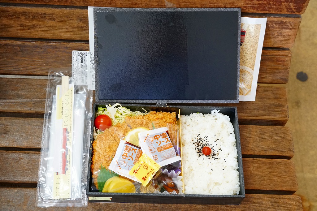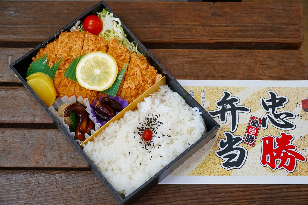 2011(平成23)年4月に発売か。「里山弁当」に続く、いすみ鉄道の駅弁の第2弾。駅弁の名前は戦国武将で大多喜藩10万石の初代藩主である本多忠勝にちなみ、駅弁の中身はその名にちなんだトンカツ弁当。中身は日の丸御飯とトンカツ1枚とキャベツ千切りに、タコ、花豆、たくあん、プチトマト、パセリを添えたもの。つまりシンプルなトンカツ弁当。大きく適度に柔らかく、衣がサクサクの良いトンカツが印象的。単に食べるだけでも、おいしいお弁当。