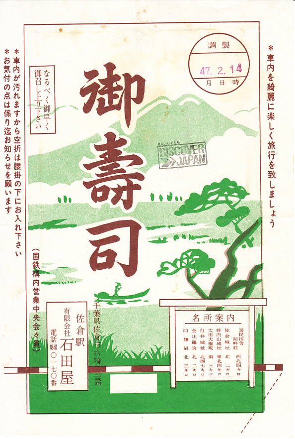 1972(昭和47)年2月14日の調製と思われる、昔の佐倉駅弁の掛紙。名所案内の内容から考えて、印旛沼と筑波山を描いたものと想像する。記載内容から1970年代のものであることに間違いないが、当時としてもずいぶん古めかしいスタイルの掛紙だったのではないか。佐倉駅では長らくいせやと石田屋が、駅弁やアイスクリームの立ち売りで競った。