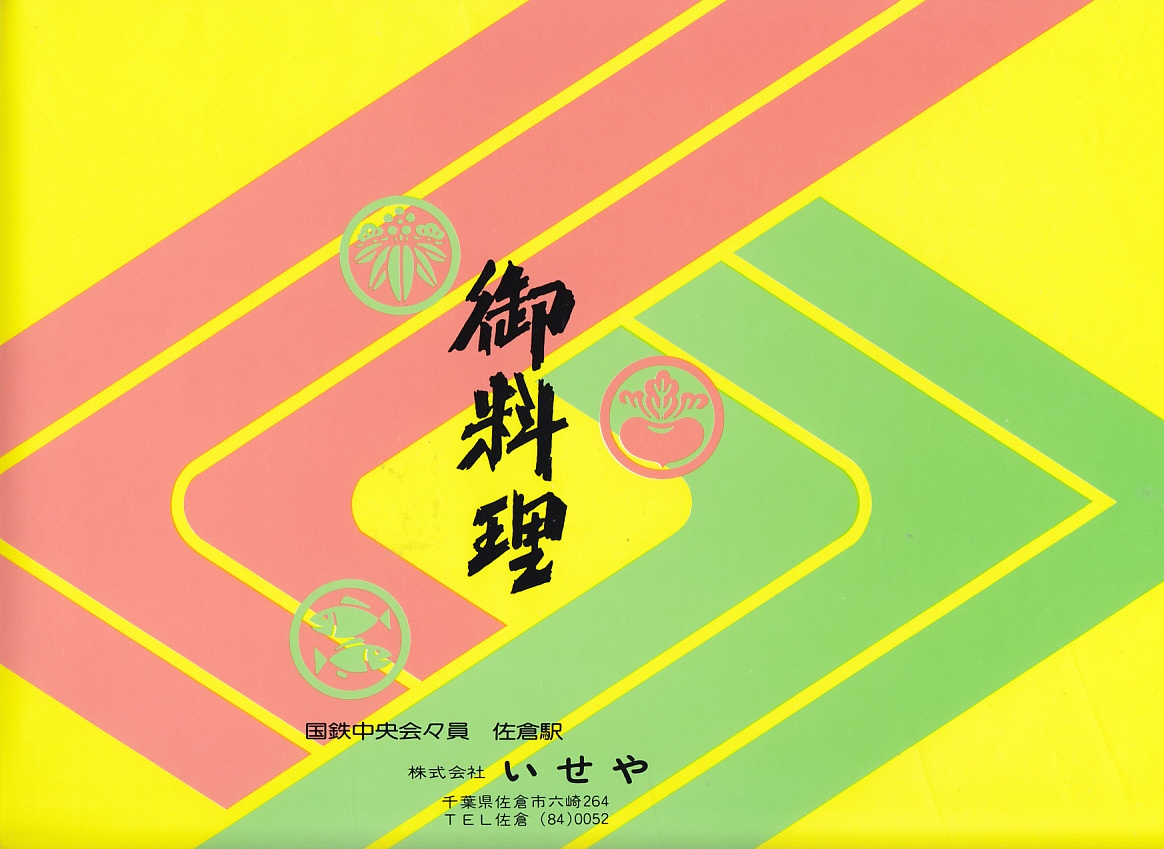 1980年代のものと思われる、昔の佐倉駅弁の掛紙。商品名からは仕出し弁当向けの掛紙にも思えるが、掛紙には「国鉄中央会々員 佐倉駅」の文字が見える。