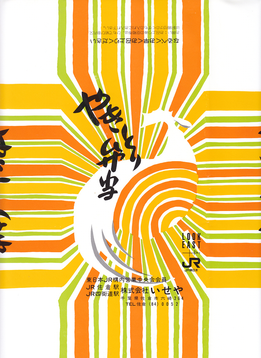 1990年代のものと思われる、昔の佐倉駅弁の掛紙。後のやきとり弁当と同じ絵柄を持ち、当時はボール紙箱でなく掛紙が使われていたことが分かる。