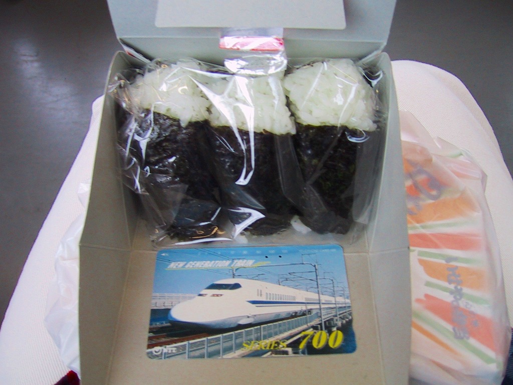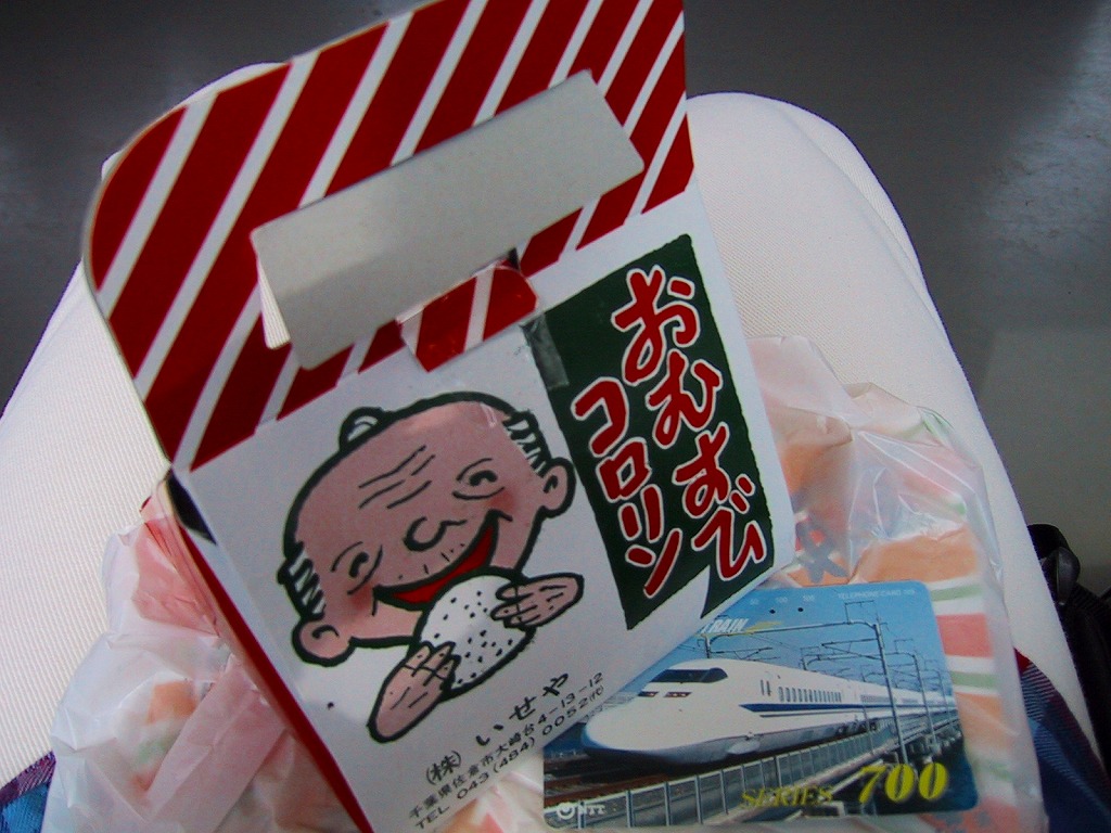 ボール紙を立体に組み立てたスナック菓子のようなパッケージの中に、おむすびが3つで380円+消費税。おむすびは最近はコンビニでも復活しつつある、あらかじめ海苔が巻かれて湿ったタイプで、かわいらしい外観に懐かしい味。駅構内では買えず、駅前広場に面した階段下の小さな小さな売店で販売されていたが、2002年3月31日限りで駅弁業者の撤退により終売となった。