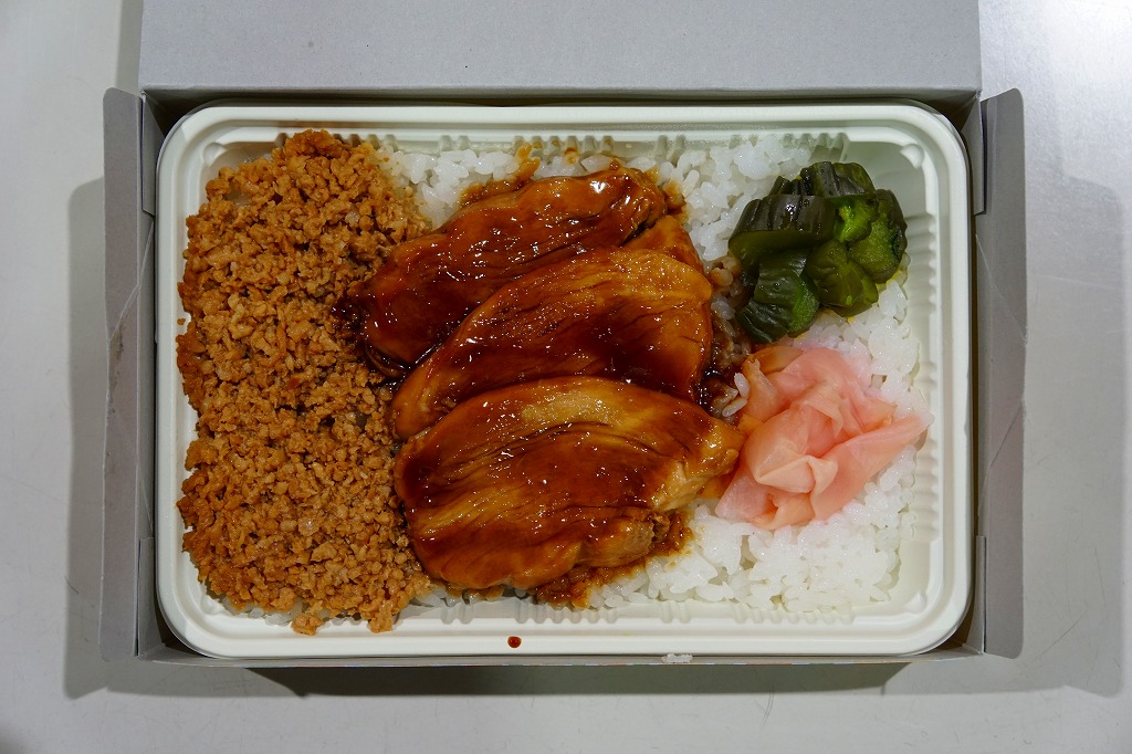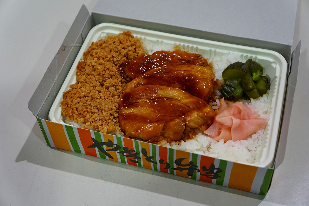 1961(昭和36)年に発売された、かつての佐倉駅弁の代表格。ボール紙のパッケージに白いトレーを入れ、その容器いっぱいに白御飯を敷き詰め、甘めのタレにからめた脂身のない地鶏胸肉の焼き鳥と鶏そぼろを載せた駅弁。21世紀になってJR東日本の発足当初の観光キャンペーン「LOOK EAST」のロゴマークを見るとは思わなかった。2002年3月31日限りで駅弁業者の撤退により、駅弁としては終売となったが、佐倉でのイベントで販売されたり、仕出し弁当として調製元へ注文することができた。2017年1月の同社の破産により、今は買えない模様。