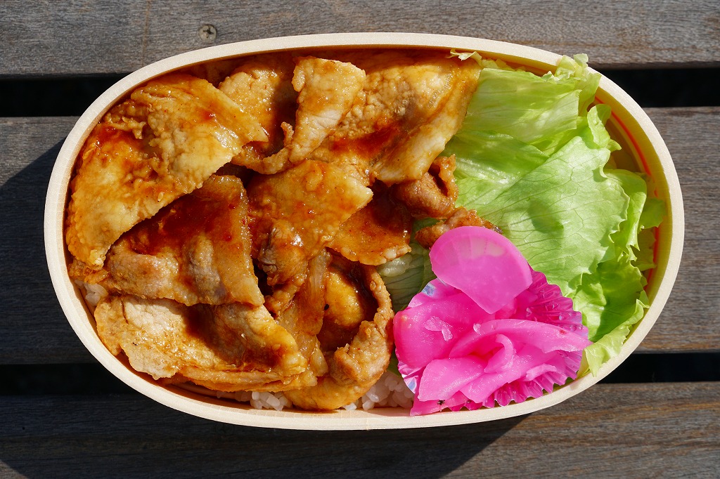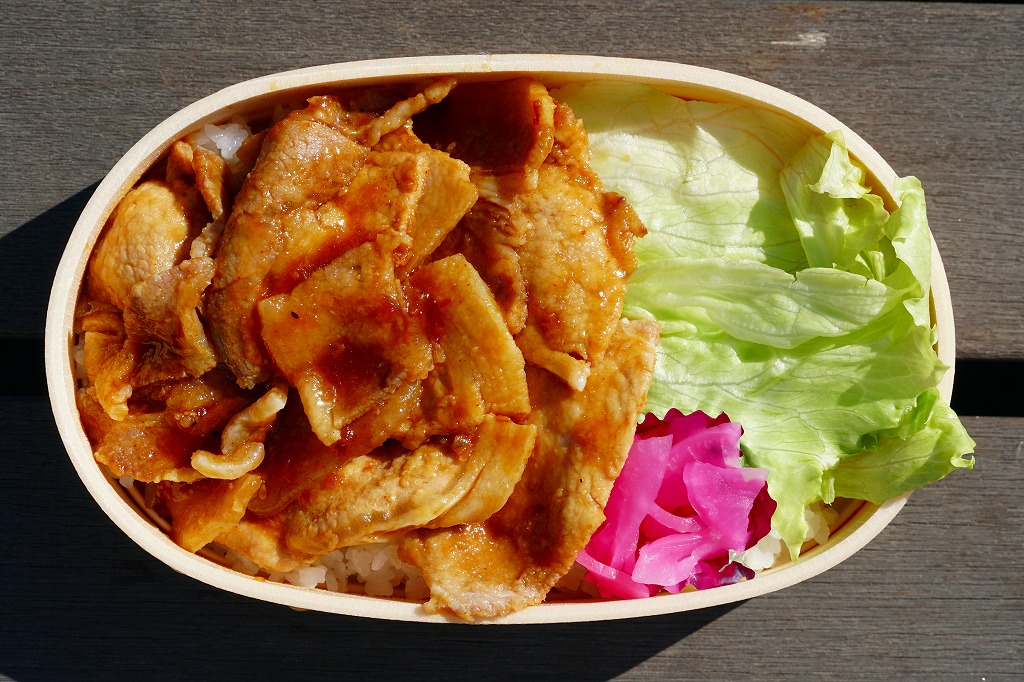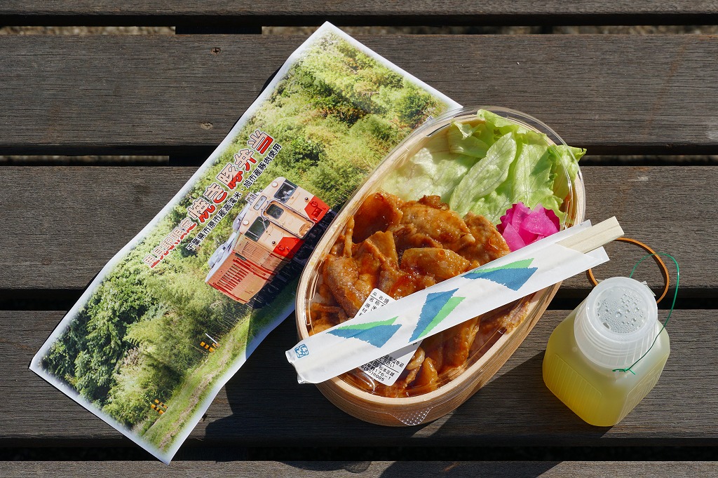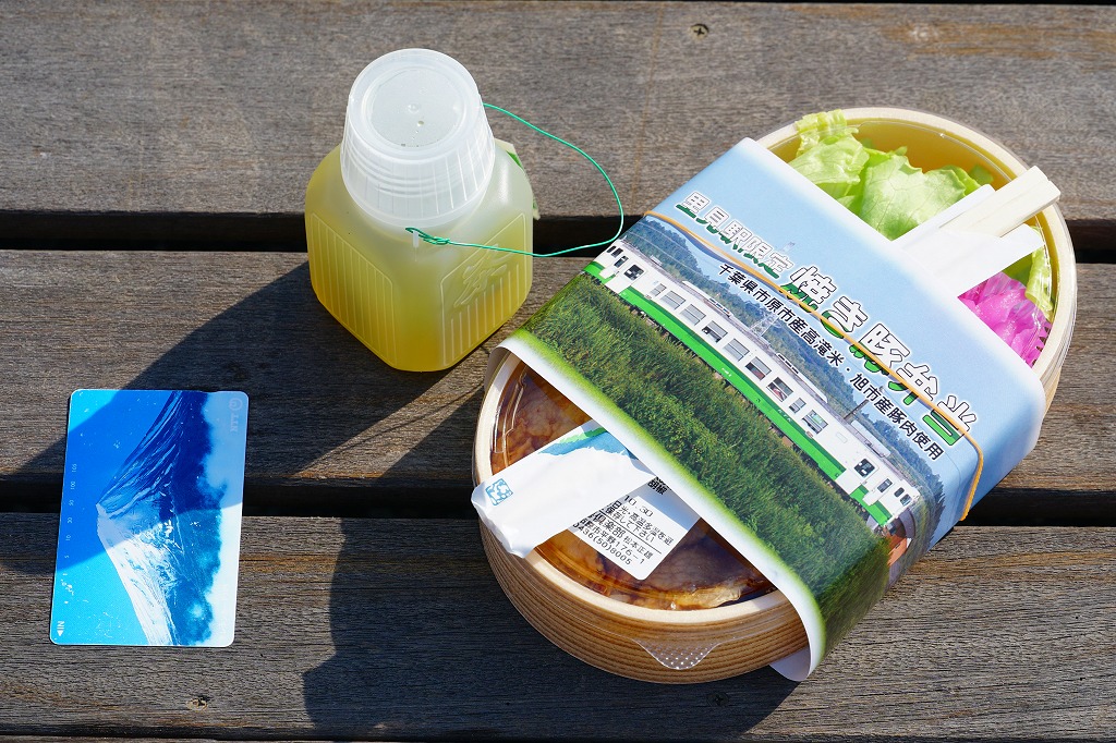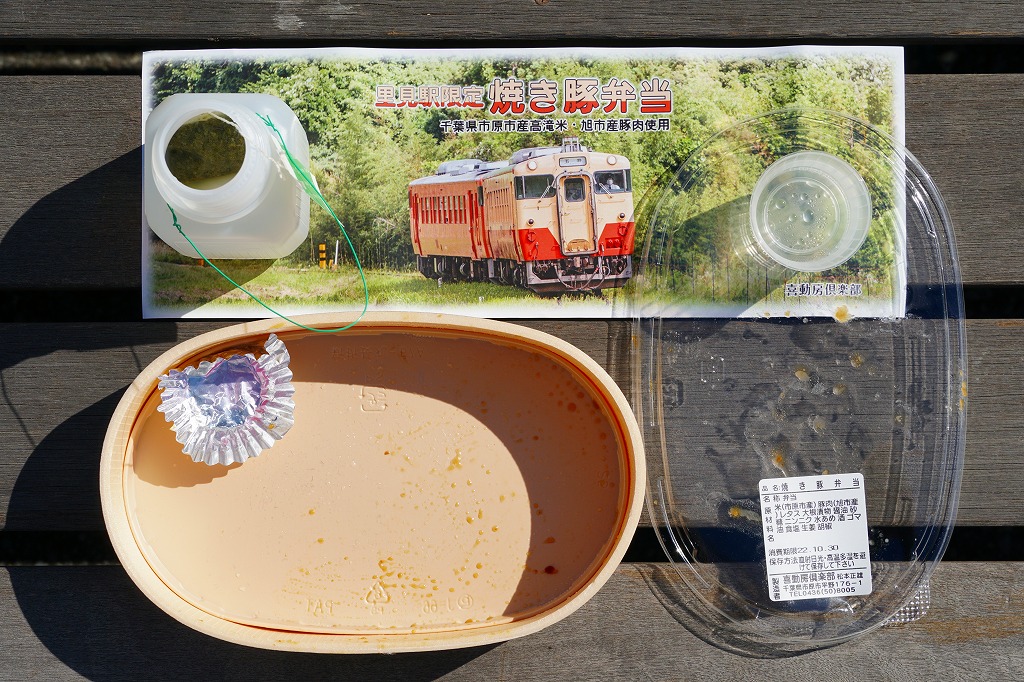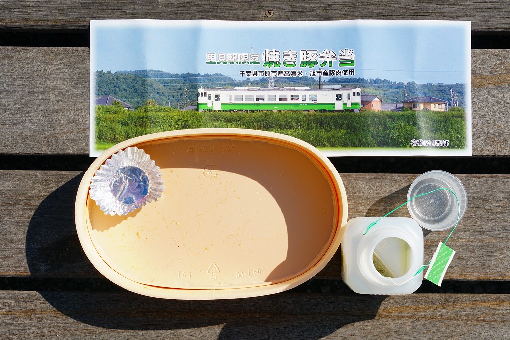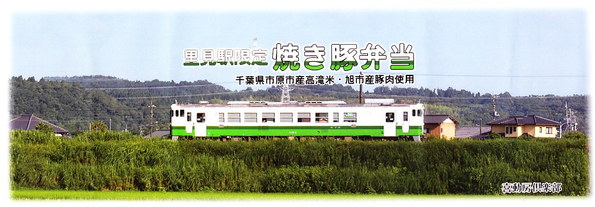 2021(令和3)年8月までに里見駅で発売か。不定の土休日に、里見駅のホーム上で、様々な飲食物等に混じって売られるお弁当。長円形の柔らかい容器に、小湊鐵道の列車の写真を使う掛紙2種類のいずれかを巻く。中身は千葉県市原市産高滝米の白飯を、旭市産の焼き豚で覆い、レタスと大根桜漬を添えるもの。甘辛な醤油だれで味わう、みずみずしい豚丼。ポリ容器のお茶とセットで販売。2023年時点で全て受注生産となり、購入には前日までにSNSかEメールでの、または当日に電話での予約が必要である模様。価格は2021年時点で1,000円、2025年時点で1,200円。