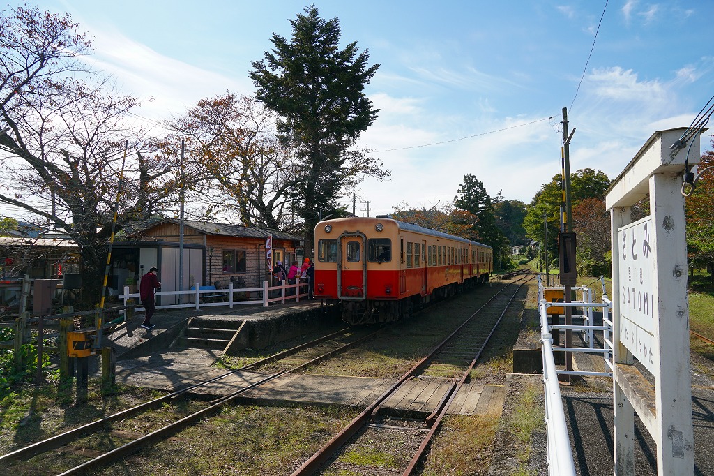五井駅から小湊鐵道で45分。里見駅は小湊鐵道線の主要駅のひとつで、トロッコ列車が停車し、過去には砂利の出荷で賑わった。不定の週末に喜動房倶楽部による物売りがあるといい、駅弁のような弁当が売られることもあるらしい。1925(大正14)年3月7日開業、千葉県市原市平野。