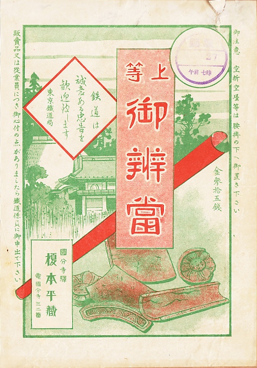 1928(昭和3)年10月27日7時の調製と思われる、昔の国分寺駅弁の掛紙。掛紙に描かれるのは、武蔵国分寺の楼門や当時の本堂に出土品だろうか。この時代の駅弁掛紙として、標準的な構成。中央本線の国分寺駅に駅弁があったことなど、記録上も記憶でもほぼ失われていると思う。