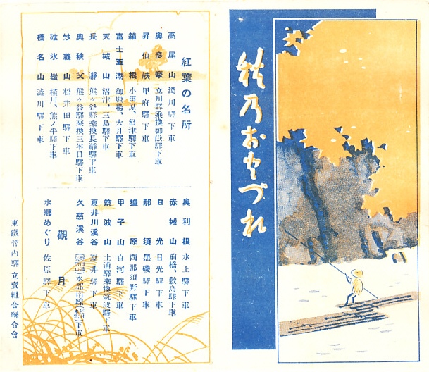 おそらく1930年代のものと思われる、昔の関東地方の紙片。「東鐵管内驛立賣組合聯合會」の会員、つまり当時の主に関東地方の駅弁屋が、共通で使用した掛紙かチラシかしおりか。紅葉名所の名前と下車駅をたくさん列記する。その内容は、熊ノ平駅と筑波駅がなくなった以外は今でも通用しそう。佐原の水郷めぐりを「観月」の名所に挙げたのは、今にない視点。