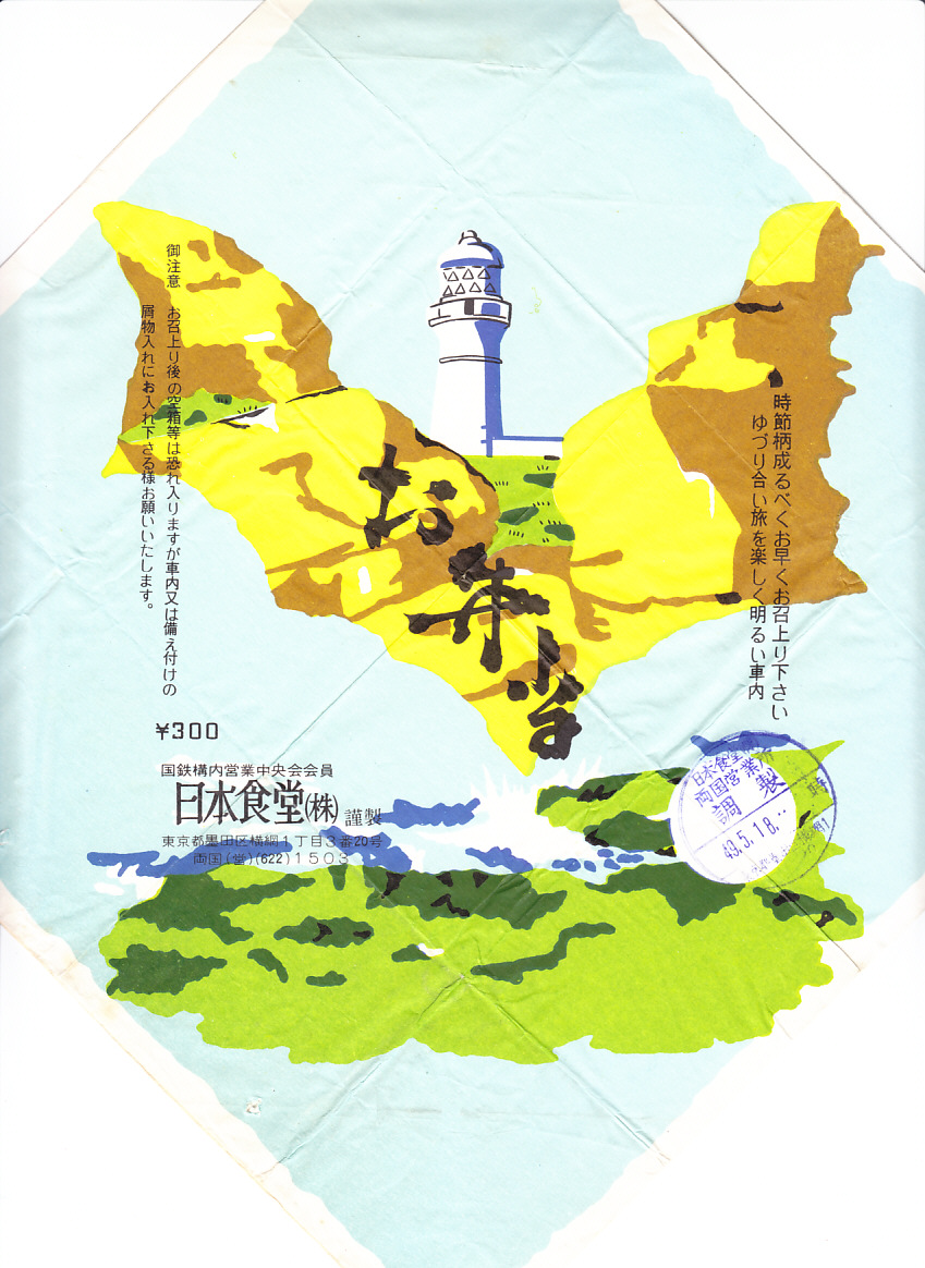 1974(昭和49)年5月18日の調製と思われる、昔の両国駅弁の掛紙。当時の日本食堂は東京都内の東西南北の鉄道ターミナルについて、南の港区海岸の調理所では東京駅弁を、北の台東区東上野の上野支店では上野駅弁を、東の墨田区横網の両国営業所では両国駅弁を、それぞれ調製していた。西の新宿駅には田中屋がいた。両国駅は千葉県方面のターミナル。絵柄は千葉の灯台や海岸の風景をイメージしたのだろう。1972(昭和47)年7月には総武本線が東京駅へ乗り入れ、東のターミナルも東京駅に移り変わっていく。
