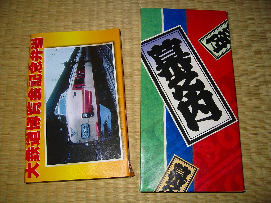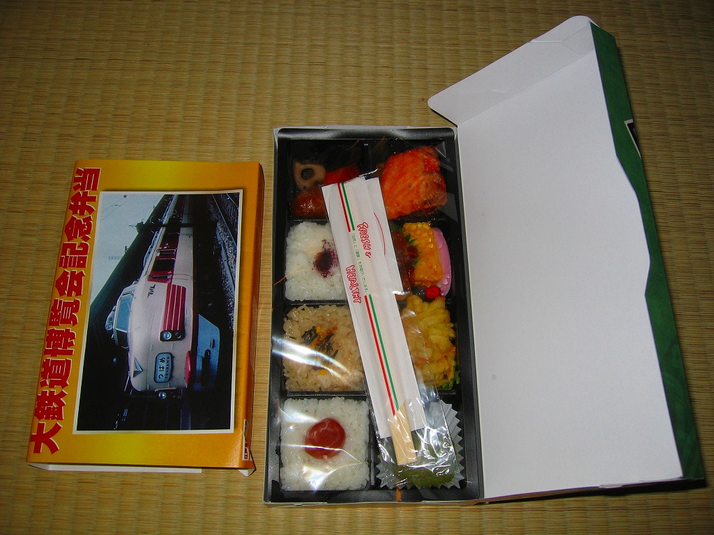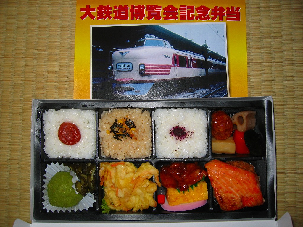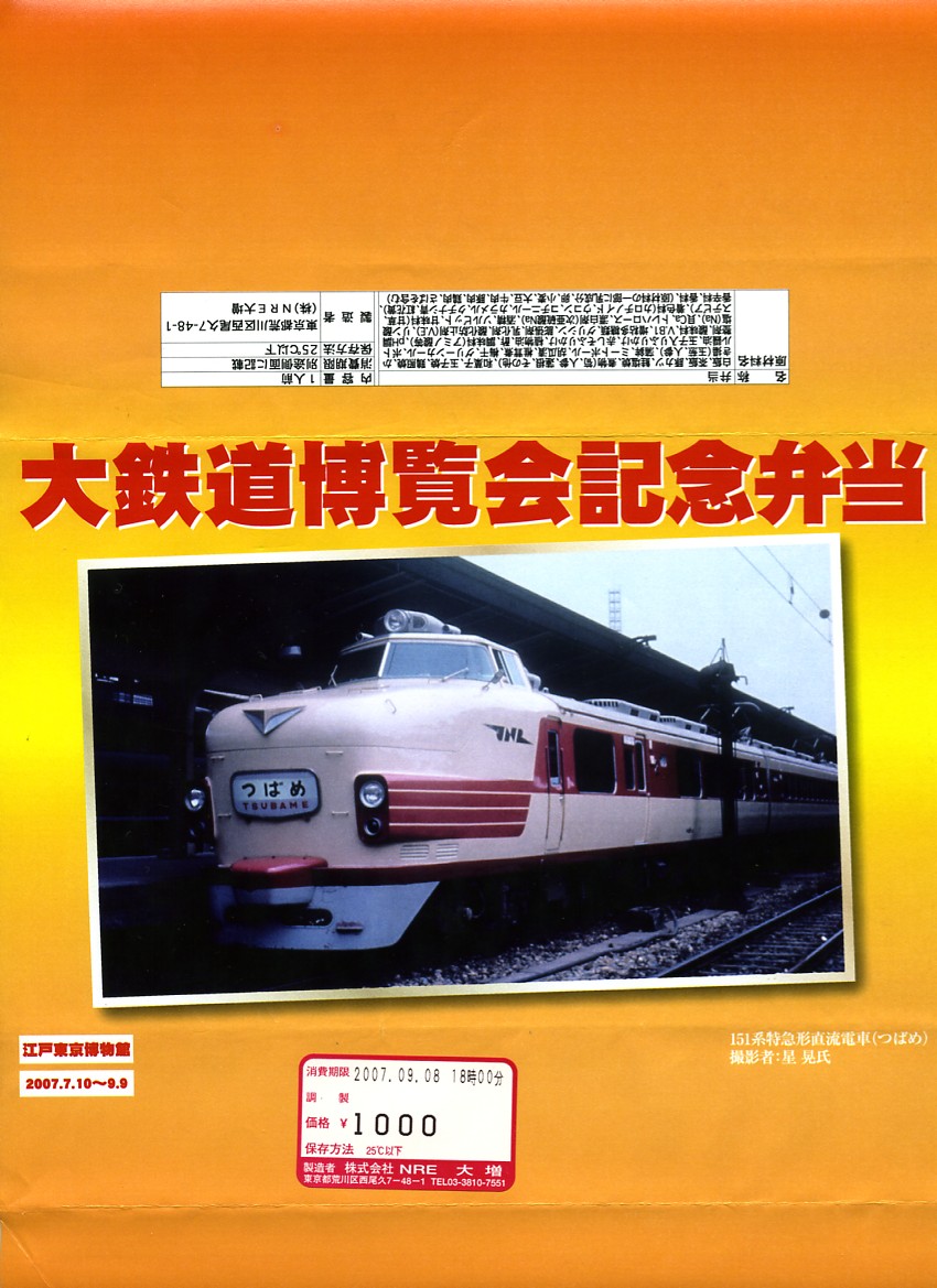 2007(平成19)年7月10日から9月9日まで江戸東京博物館で開催された企画展「大鉄道博覧会」の売店で販売された記念弁当。容器と中身は偶然か必然か、同年8月25日に販売された「夏休みフェア記念弁当」とほぼ同じ。しかしこちらが200円高い。弁当としての実需がない、イベント用の記念商品だから、きっとこれでよい。カラーコピーの掛紙には新幹線開業前の東海道本線の特急「つばめ」の写真が載る。