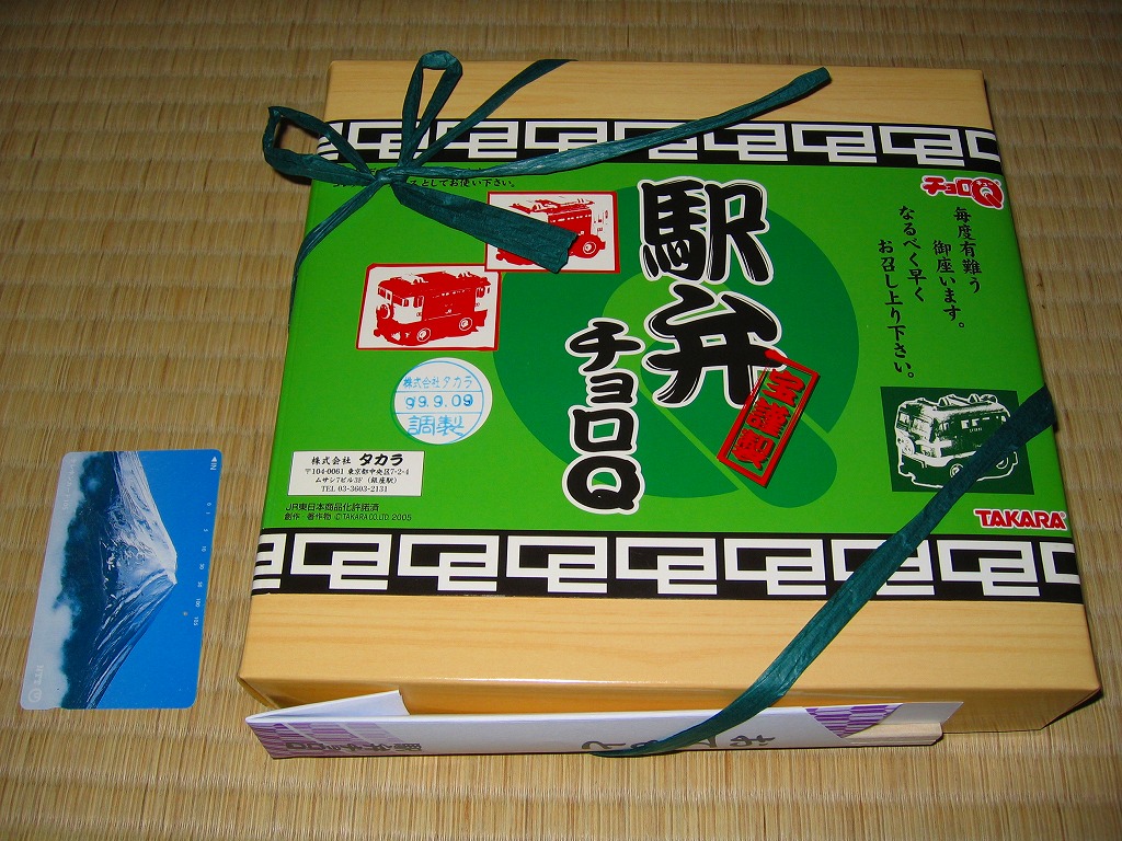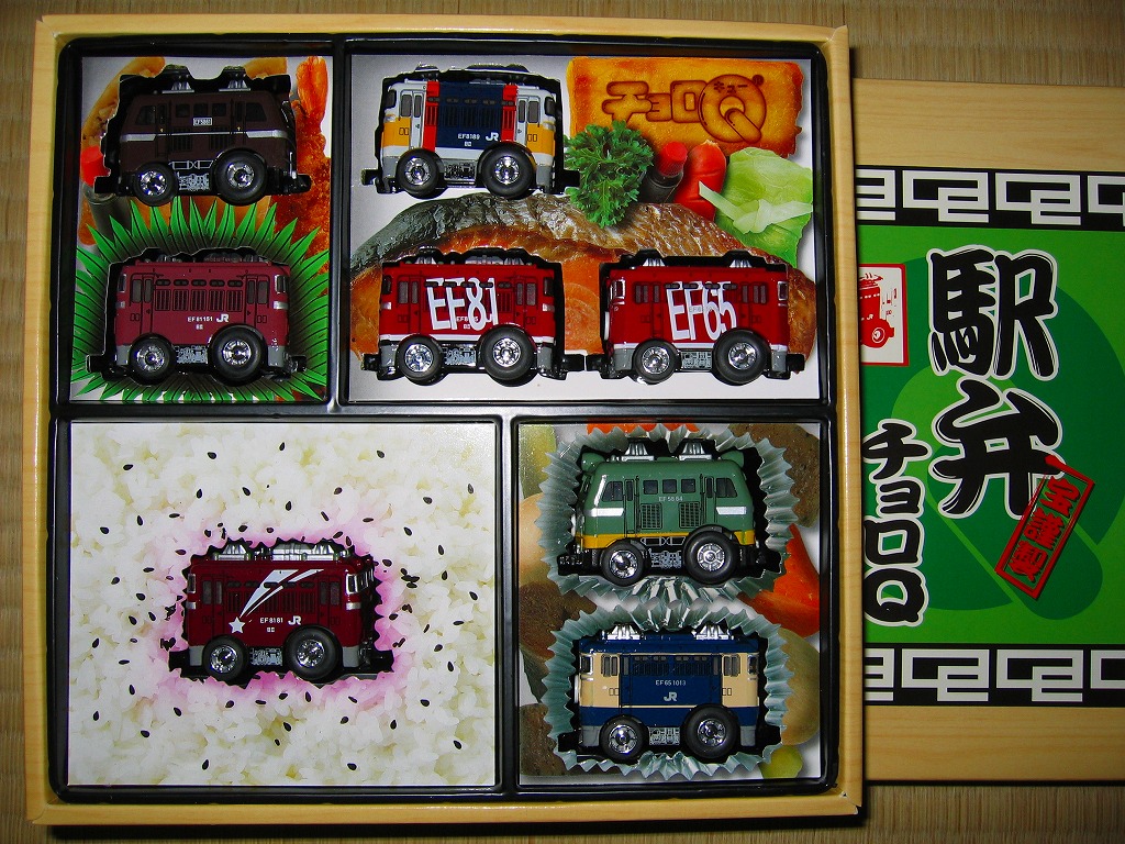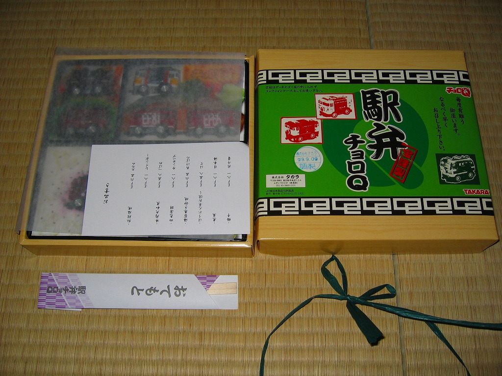 つまり、タカラのゼンマイ駆動ミニカー「チョロQ」の国鉄・JR電気機関車版を収める容器を、駅弁風に仕立てたもの。子供向けや駅弁ファン向けというより、チョロQコレクター向けの商品だろう。こういう発想を玩具メーカーが持つくらい、駅弁にブランド力があるのだと思う。メーカーの所在地が東京なので、東京都の駅弁として収蔵。
