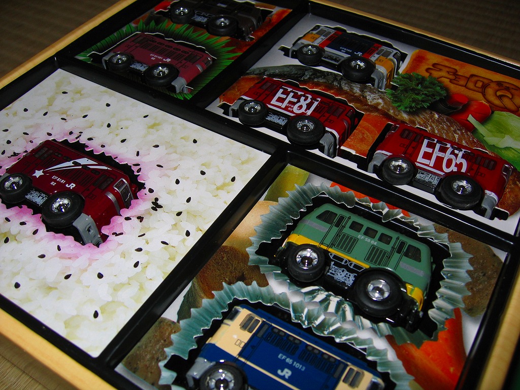 2006(平成18)年1月に発売、3,000個を販売。組み立てて厚みを出したふた付きの、木目調の大きなボール紙製容器に、商品名を書いた緑色の掛紙をかけて、ひもでしばって段ボール箱に詰める。中身は梅干し色のEF8181北斗星塗装が載る御飯部分、EF5864青大将塗装とEF651013ブルトレ塗装が入る煮物部分、EF81189カシオペア色、EF5861お召機とEF81151交直流色が入る揚げ物部分、EF8195レインボー色とEF651019レインボー色が入るおかず部分。