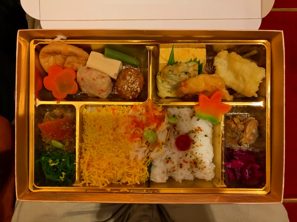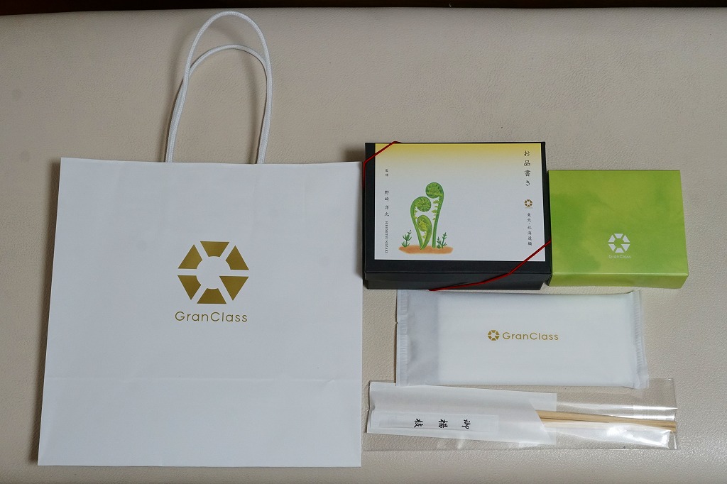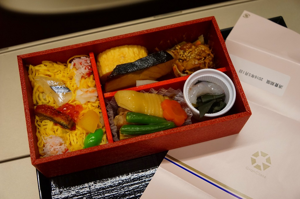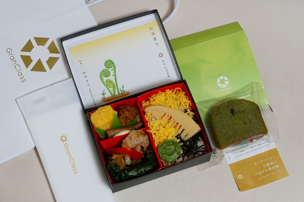 北陸新幹線でグランクラスの乗客に1個提供される軽食。これは2016(平成28)年当時で和洋が選べるうちの和食で、グランクラスのマークを印刷した掛紙に包まれた箱にちらし寿司、玉子焼、ブリ照焼、豚生姜焼、温野菜サラダ、治部煮、酢の物などが収まっていた。内容は四季で変わる模様。調製元は駅弁屋ではなく、石川県金沢の押寿司屋の芝寿しであった。