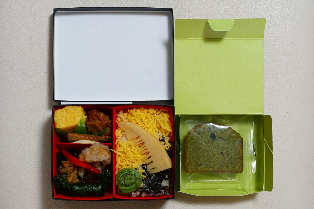 グランクラスのロゴマークのみを記した白い紙袋に、ふたつの箱と、割りばしとおしぼりを入れる。中身は大きく黒い箱が軽食で、茶飯を錦糸卵と刻み海苔とタケノコとこごみで覆い、玉子焼、鶏肉揚げ、にしんチーズ巻き、焼ホタテ、なすとお麩の味噌和え、赤パプリカ、しそ巻きを添える。小さく緑色の箱が茶菓子で、よもぎと三温糖のパウンドケーキ。1,680円相当の食べ物ではないと思うが、グランクラスに乗ると運賃と料金で8,000円以上はかかるから、体験としては安上がりなのだろう。7月と9月にも販売を予定。