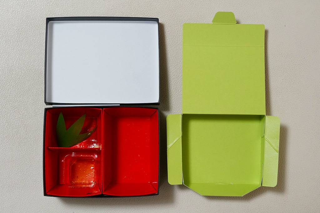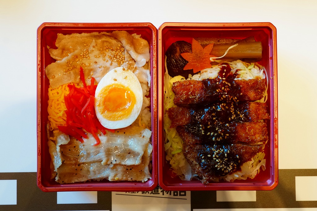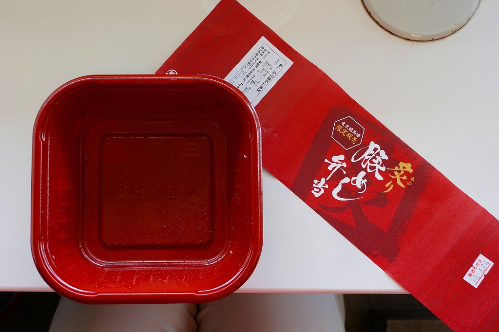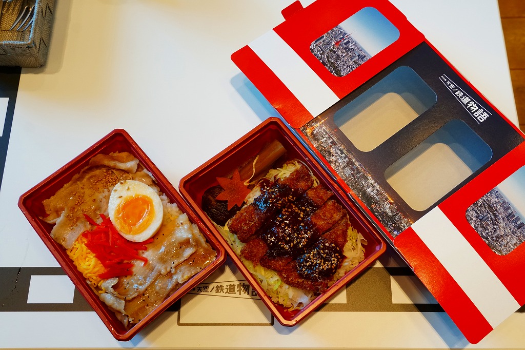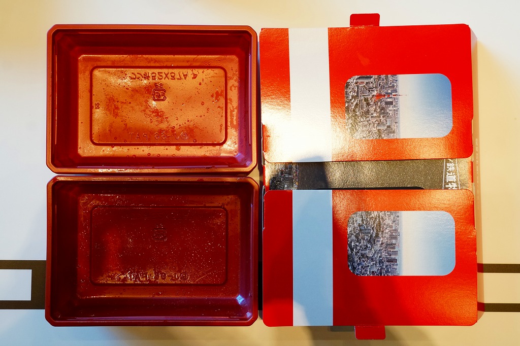六本木ヒルズの展望フロアの眺望写真を載せた、赤い車体の通勤電車の乗降扉をイメージしたスリーブは、ドアを開くと中身が顔をのぞかせる。中身は6種類から注文時にふたつ選択し、その選択により価格が異なる。今回は最も安い「名古屋 みそかつ 650円」と「鹿児島 黒豚W 750円」を組み合わせた。容器ごと加熱したと思われる、アツアツの状態で提供された。写真にはないが、ポリ茶瓶の温茶もついていた。