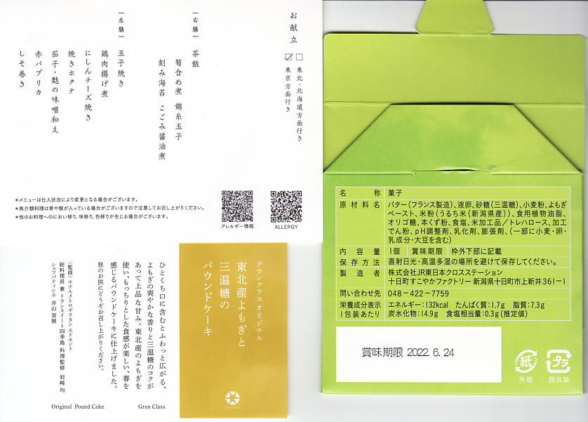JR東日本の新幹線で提供されるグランクラス軽食・茶菓子セットが、2022(令和4)年5月11日から期間限定で市販されたもの。5月11日から24日まで東北・北海道新幹線下り列車分が、5月25日から6月7日まで北陸新幹線下り列車分が、6月8日から21日まで東北・北海道新幹線上り列車分が、東京、新宿、大宮の各駅と鉄道博物館で販売された。これは6月10日に購入したので、東北・北海道新幹線上り列車分となるのだろう。