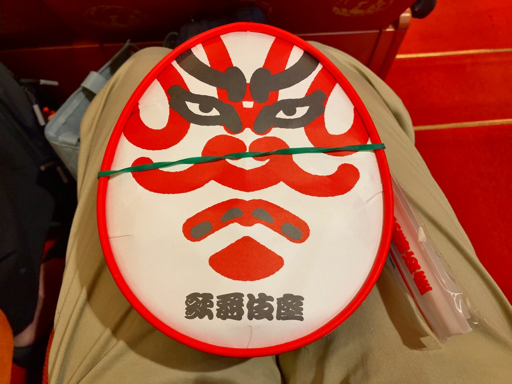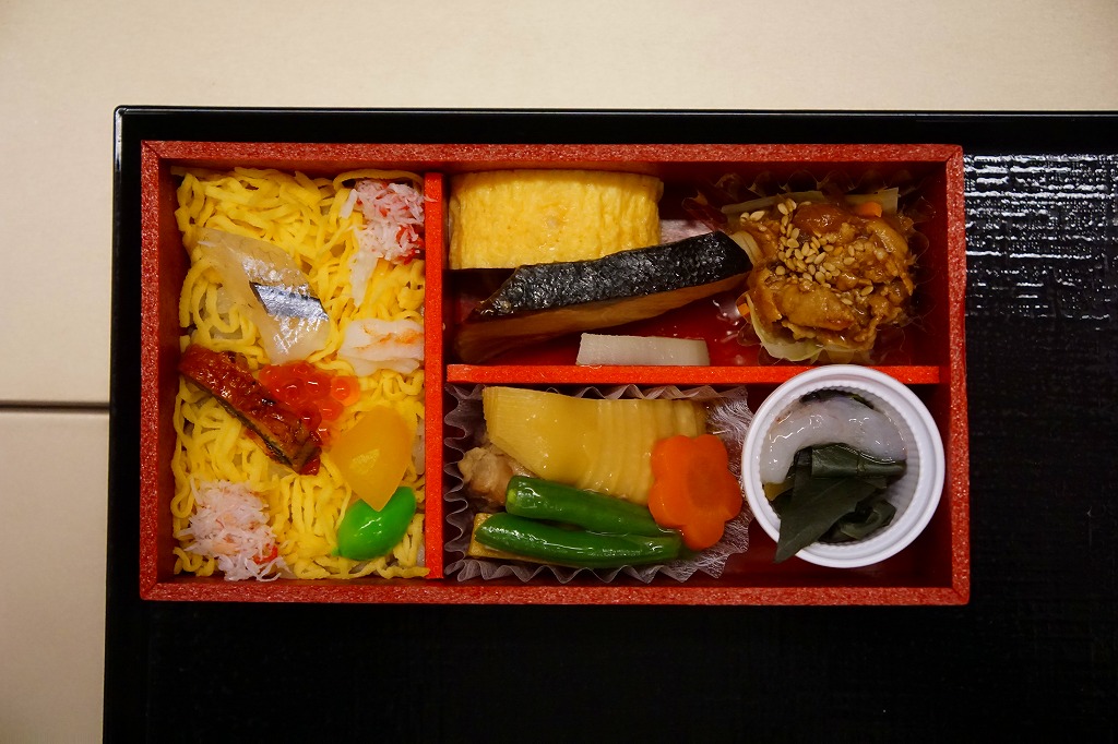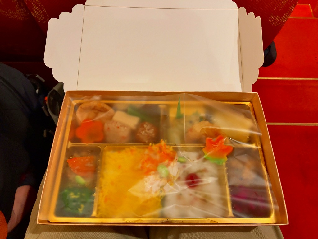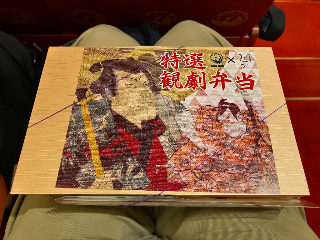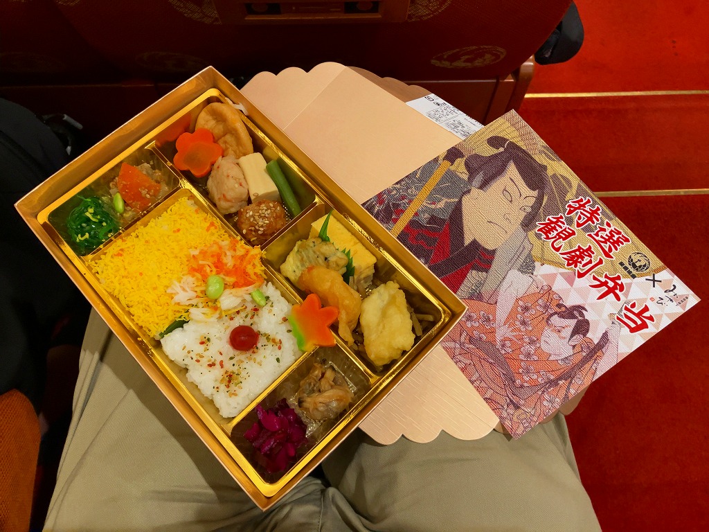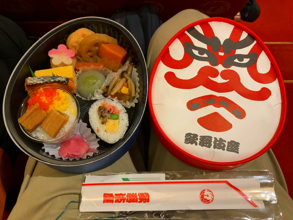 これは駅弁でなく、歌舞伎座で買えたお弁当。弁当の名前は食品表示で「十一月特製観劇弁当」とあり、おそらく歌舞伎座の演目と同じく月替わりで出しているのだろう。木目柄で大きめな紙容器に、歌舞伎の華やかな絵柄の掛紙を載せる。この容器に詰めた金色のプラ製トレーで、白飯に梅干しを据え、酢飯を錦糸卵で覆い、玉子焼きや海老やイカなどの焼き物や揚げ物、にんじんや高野豆腐やがんもどきなどの煮物、根菜や茎わかめなどの和え物、煮あさりと柴漬けを添える。東京駅の高級駅弁と同じような雰囲気。この調製元の弁当は以前から、東京駅の駅弁売店「膳まい」改め「HANAGATAYA」でも売られている。