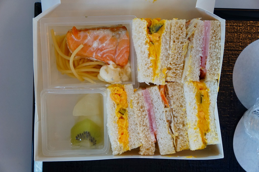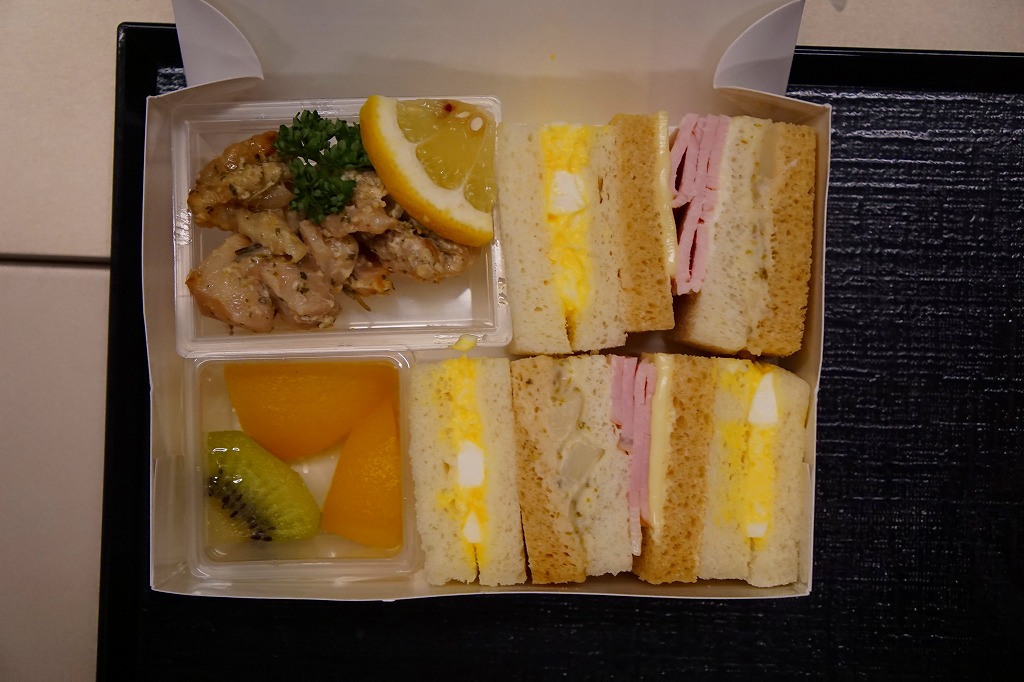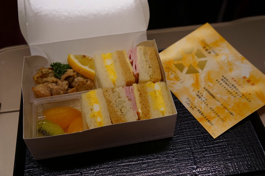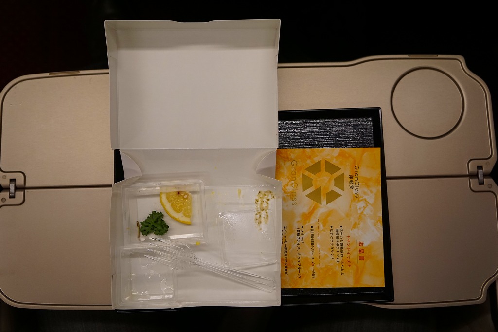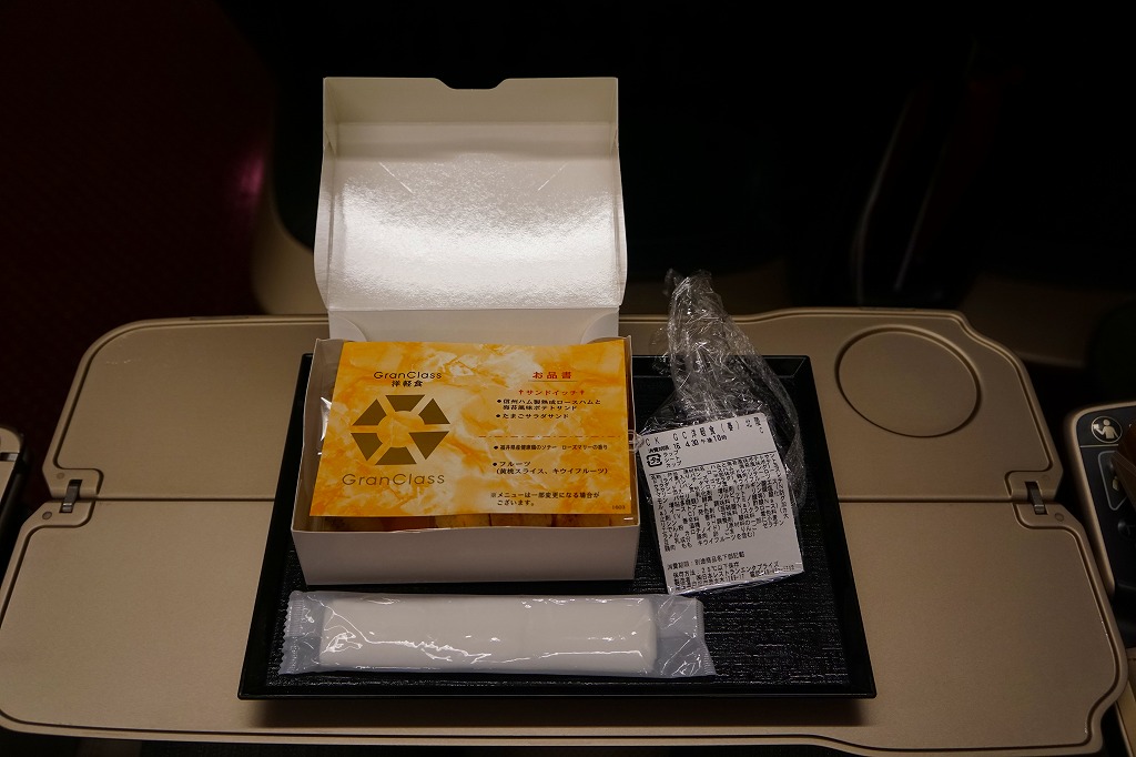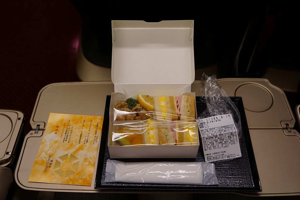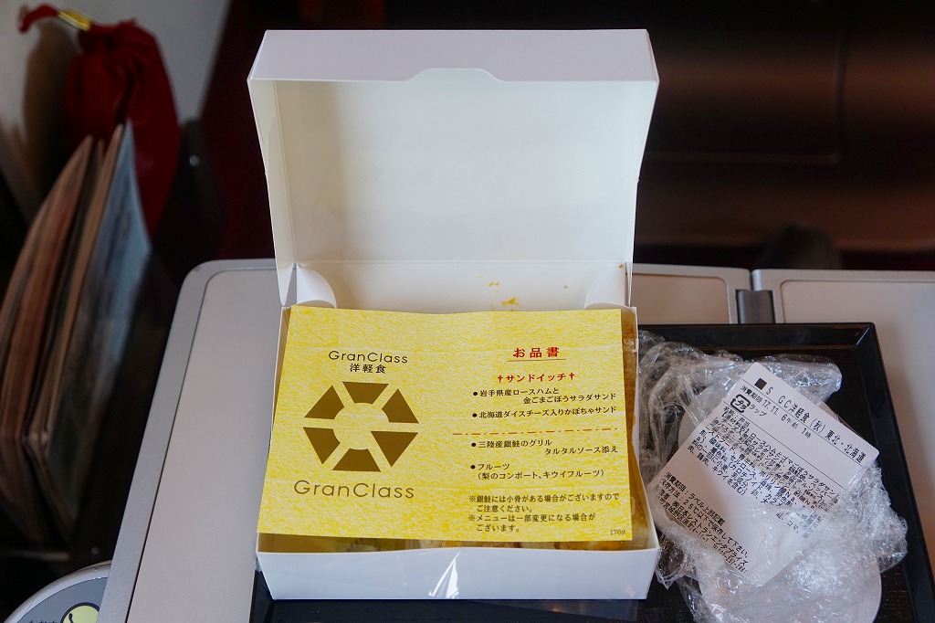 東北新幹線でグランクラスの乗客に1個提供される軽食。これは2017(平成29)年当時で和洋が選べるうちの洋食で、グランクラスのマークを印刷した紙箱に、ハムときんぴらごぼうのサンド、かぼちゃサンド、鮭とスパゲティ、梨とキウイのフルーツが収まっていた。内容は四季で変わる模様。調製元は仙台駅弁の日本レストランエンタプライズであった。