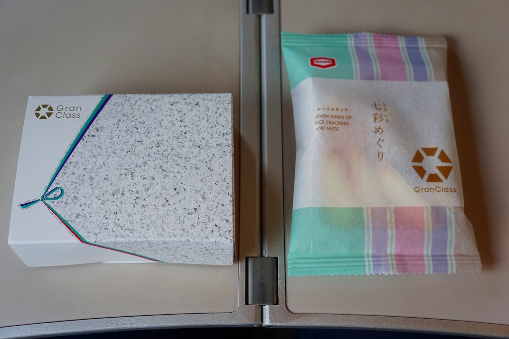 2011(平成23)年3月5日の東北新幹線はやぶさ号とE5系新幹線電車の営業運転開始により設定された、グリーン車より料金の高い旅客設備「グランクラス」は、E5系電車の増加と北陸新幹線の開業により設定本数を増やしていった。一方で軽食とフリードリンクを提供する列車の本数は順次縮小されており、2021年3月に東北新幹線「はやて」「やまびこ」の全列車でサービスを終了、2022年10月に北陸新幹線「はくたか」の全列車でサービスを終了予定。この軽食・茶菓子セットを見られる機会も少なくなる。