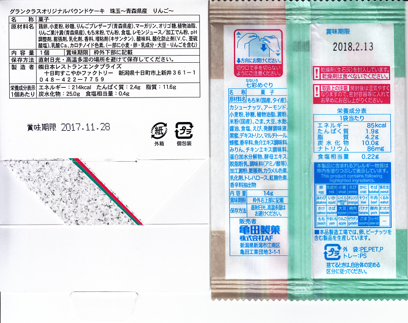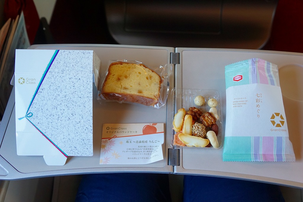 新幹線のグランクラスを、人生2度目の利用。前年春の北陸新幹線と違う、東北ならではのものがあるかと思ったら、シードルと日本酒が長野県産から青森県産に変わっただけだった。軽食や飲料とともに提供された、スイーツ(りんごのパウンドケーキ)の紙箱とおつまみ(あられ)の袋にも、グランクラスのマークが入る。