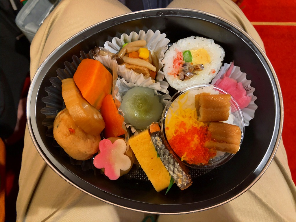 これは駅弁でなく、歌舞伎座で買えたお弁当。かつて羽田空港の空弁で見たような気がする、張り子の構造を思わせる隈取柄の紙容器にプラ製のトレーを収め、酢飯に煮穴子と錦糸卵ととびっこを載せたカップ「穴子ちらし」、太巻き、焼き鮭、玉子焼き、にんじんやれんこんなどの煮物、野菜ときのこのソースのハンバーグ、抹茶葛、桜大根を詰めていた。作り置きを買って食べる、さめてもおいしく座席で食べやすい、まるで駅弁のようなつくり。
