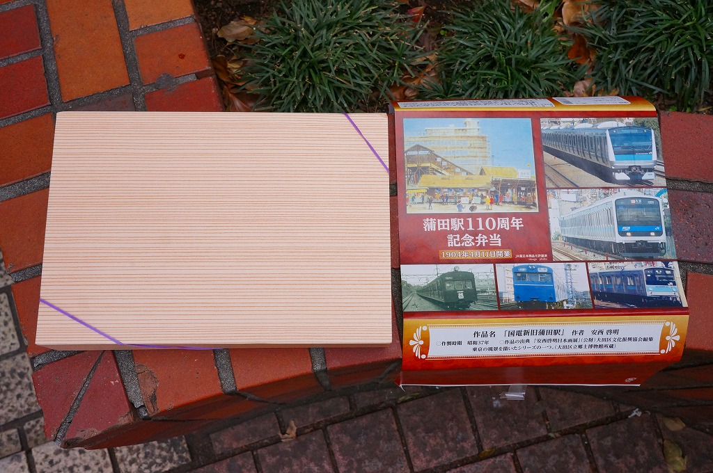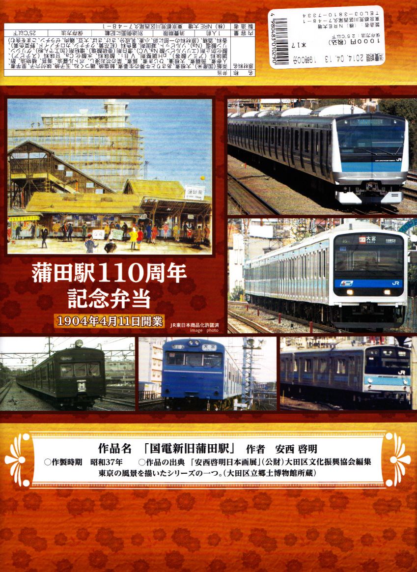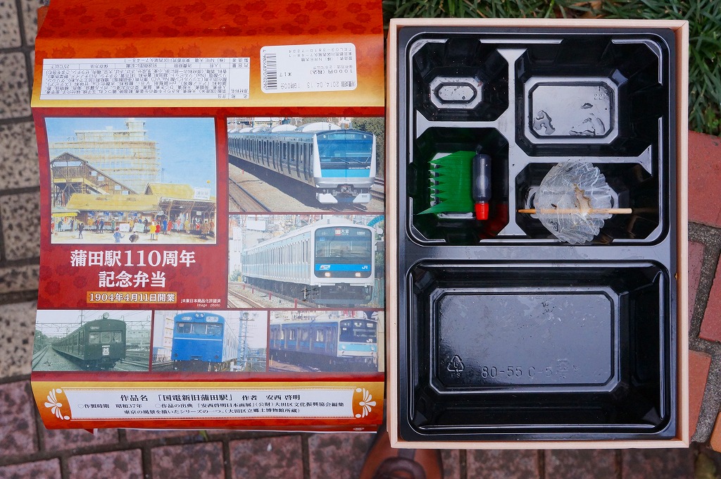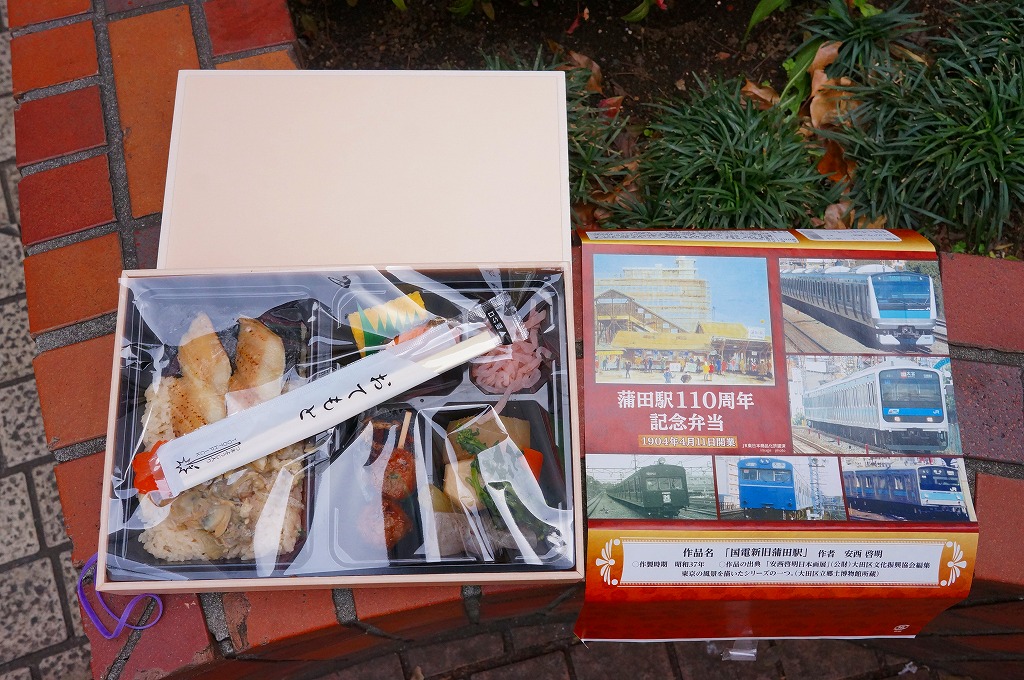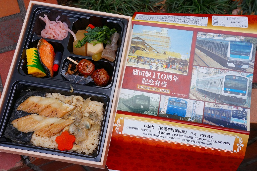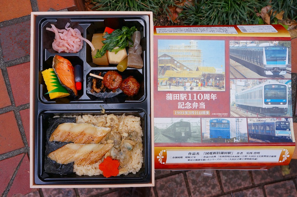 蒲田駅の開業110周年を記念して、2014(平成26)年4月12,13日の両日に蒲田駅で販売。掛紙には京浜東北線の新旧の電車5種類の写真や、半世紀以上前の蒲田駅のイラストが使われる。中身はアサリとアナゴの御飯に、焼鮭、玉子焼、肉団子、煮物、漬物。東京駅の有名な駅弁「深川めし」に、その調製元である日本レストランエンタプライズ(NRE)が売る配送弁当のおかずを足した感じで、かなりボリュームがあった。