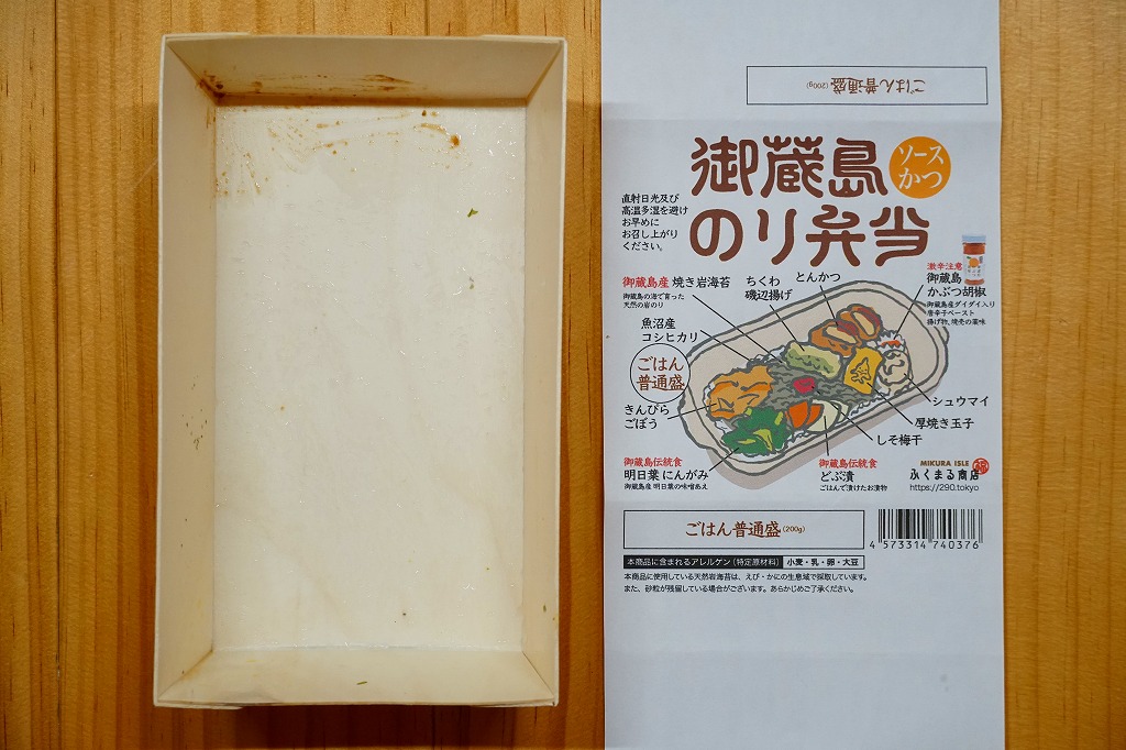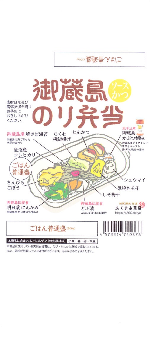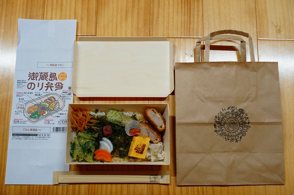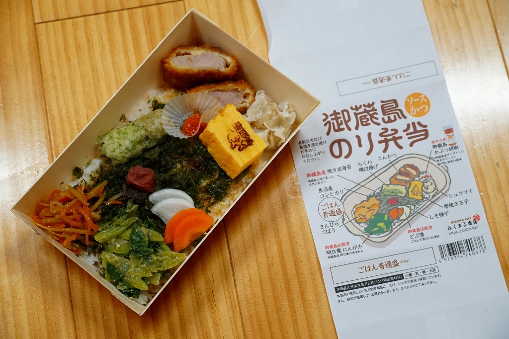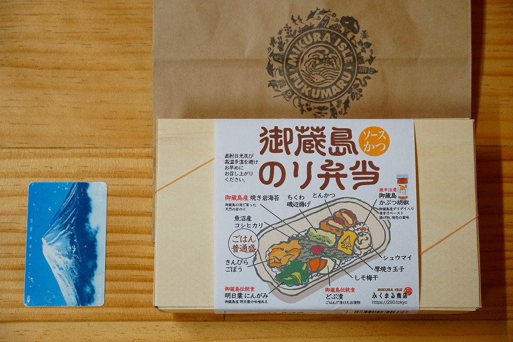 これは駅弁でなく、商店で売られるお弁当。2022年に発売か。東京都の伊豆諸島の御蔵島(みくらじま)にある土産物店「ふくまる商店」で、当日朝8時までに予約し、10時から13時までの間に受け取れる。島内の飲食店やその営業が限定的であるため、観光客向けにこのような予約弁当が提供されている。木質エコ容器に白飯を薄く敷き、御蔵島産の焼き海苔を塗り、御蔵島産の明日葉にんがみとどぶ漬、とんかつ、ちくわ磯部揚げ、きんぴらごぼう、シュウマイ、しそ梅干、イルカの焼き印付き厚焼き玉子を散らす。