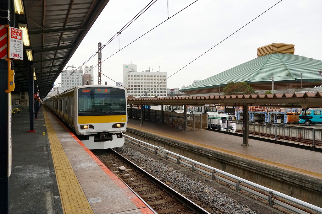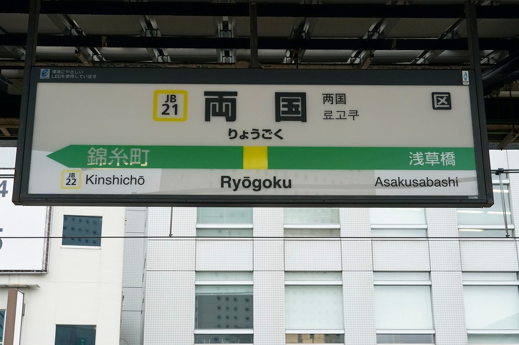 東京駅から電車を乗り継いで約20分。大相撲の興行場の立地で知られる市街地。この隅田川に面した駅は、かつて東京の千葉方面への鉄道ターミナルであり、房総半島方面の急行列車などが多く発着し、1970年代には日本食堂両国営業所が東京駅や上野駅とは異なる駅弁を販売した。1972年の総武快速線の開業でその役割を東京駅に譲り、駅弁もなくなった。1904(明治37)年4月5日開業、東京都墨田区横網一丁目。