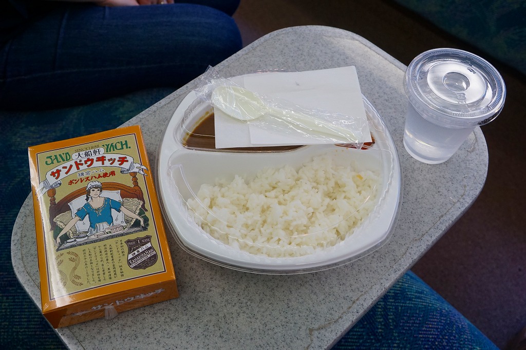 売店ではサンドイッチとシウマイも販売される。サンドイッチは過去には、カレーと同じく皿に盛ってくれたようだが、この時点では市販の駅弁をそのまま渡された。写真の1枚目にあるのは、車内でハムとチーズのサンドイッチとして売られていた「大船軒サンドウヰッチ」。シウマイは横浜駅弁の「真空パックシウマイ」を車内の電子レンジで暖めて渡される。
