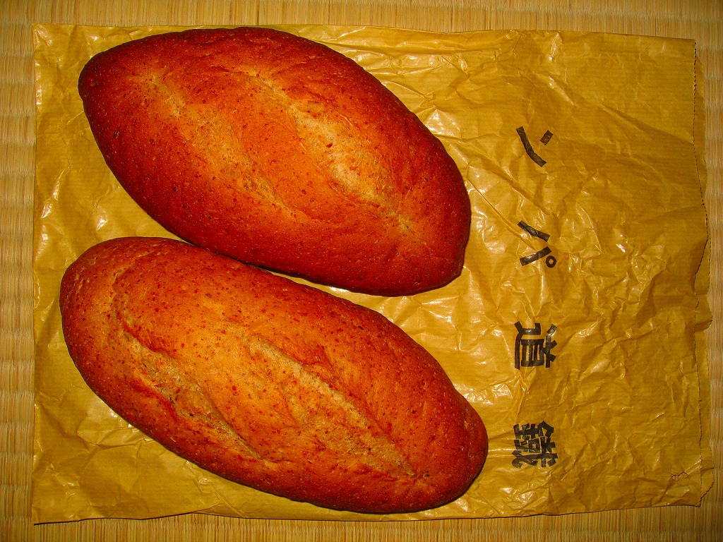 2004(平成16)年10月頃の復刻発売。粗末な感じを出した紙袋の中に、大きく固いパンの塊がふたつ入っている。見た目でも食べても満腹になるが、これ以外に何も付いていないし、固結とは言えないがアゴが鍛えられる固さなので、食べる人を選ぶと思う。それでもその品質は、本物の発売当時とは格段に良いだろう。