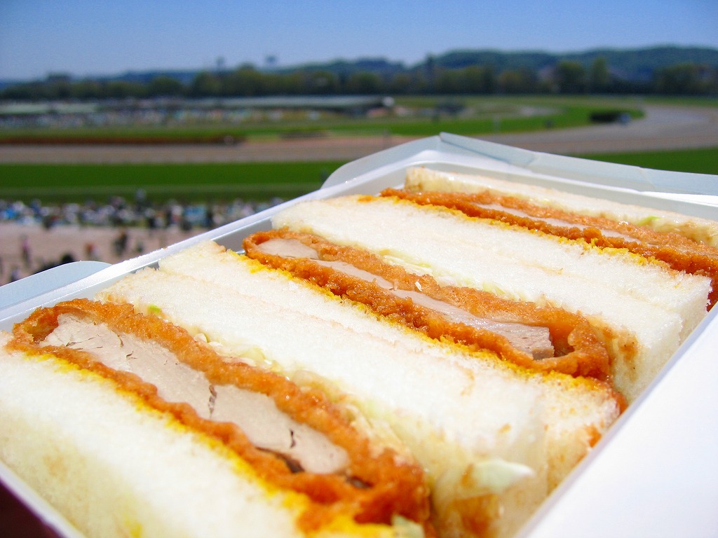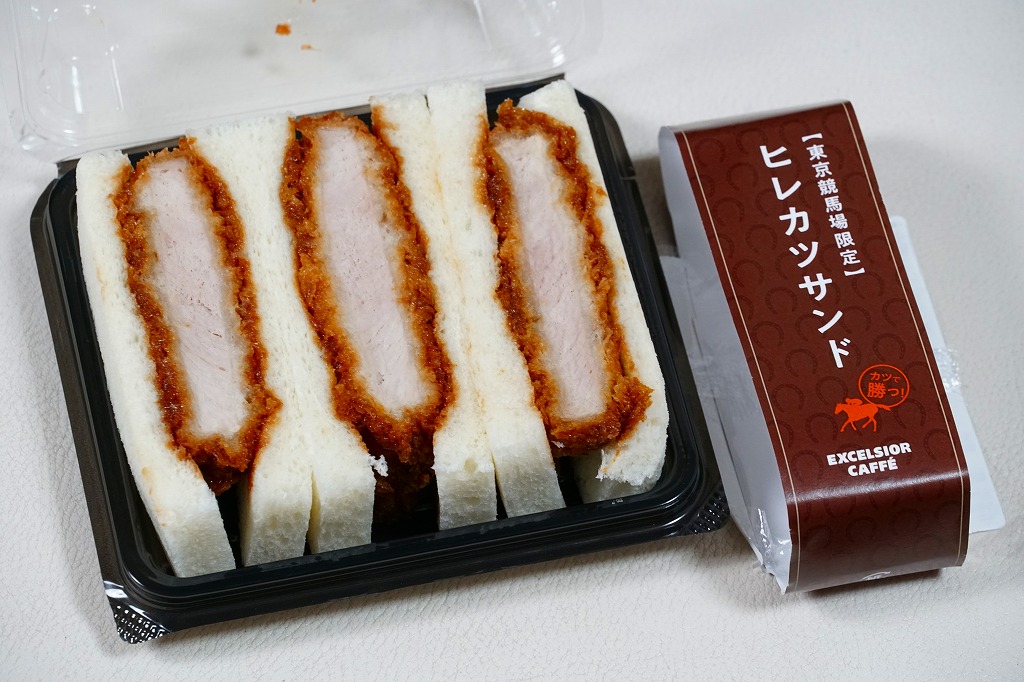 コーヒーチェーン「エクセルシオールカフェ」東京競馬場店限定のメニュー。競走馬と騎手を小さく描いた紙箱に3切れの固いカツサンドが収まる。分量、風味ともたいしたことがない場内価格。ギャンブル場で勝つサンドを買って食べること、あるいは容器を来場記念に持ち帰ることに意義がある。コーヒーとのセット売り(1,000円)もあった。2018年の再訪時、店舗は健在だったが、この商品は消えていた。