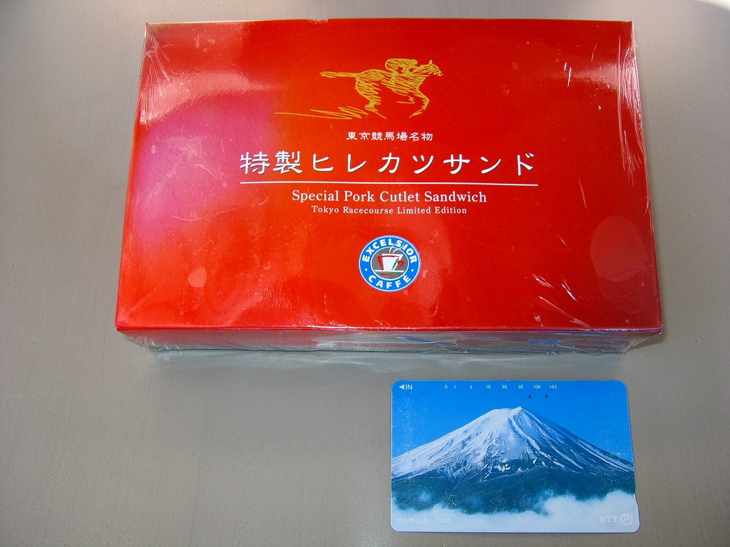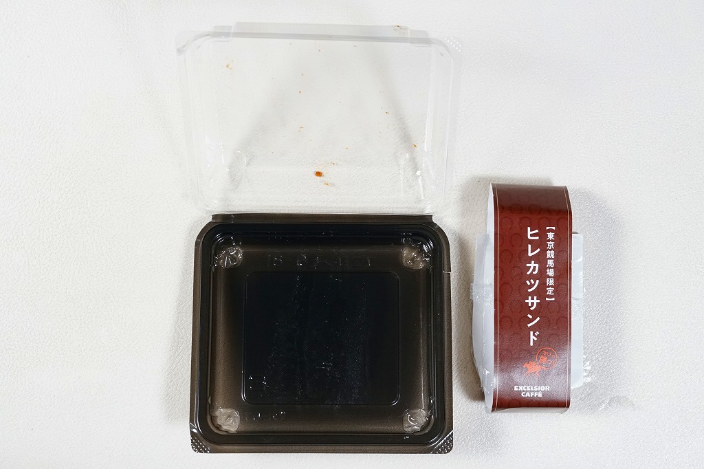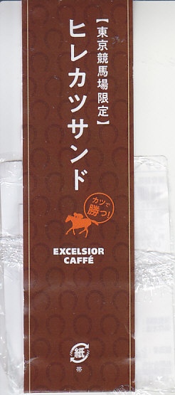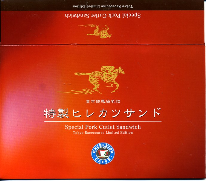 コーヒーチェーン「エクセルシオールカフェ」東京競馬場店限定のメニュー。ヒレカツのソース付けを食パンに挟んだカツサンドを3切れ、惣菜向けプラ容器に詰め、ラップで密封し、商品名を書いた茶色い紙帯を巻く。競走馬と「カツで勝つ!」の絵柄で、昭和時代の鉄火場のセンスが、令和の美しくきれいな競馬場内のカフェに残る。下記の約20年前とやっていることは同じで、値段はなんと据え置かれているが、包装も中身もだいぶ簡素になった。
