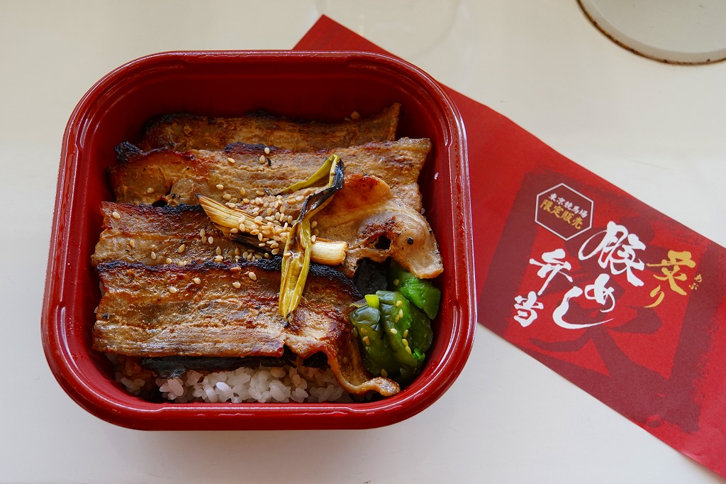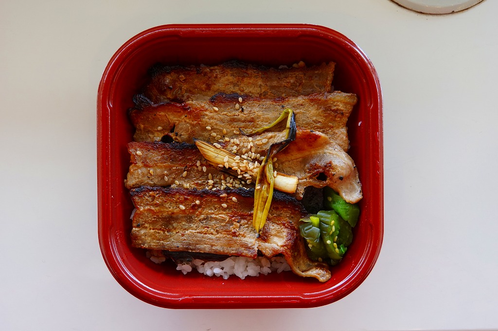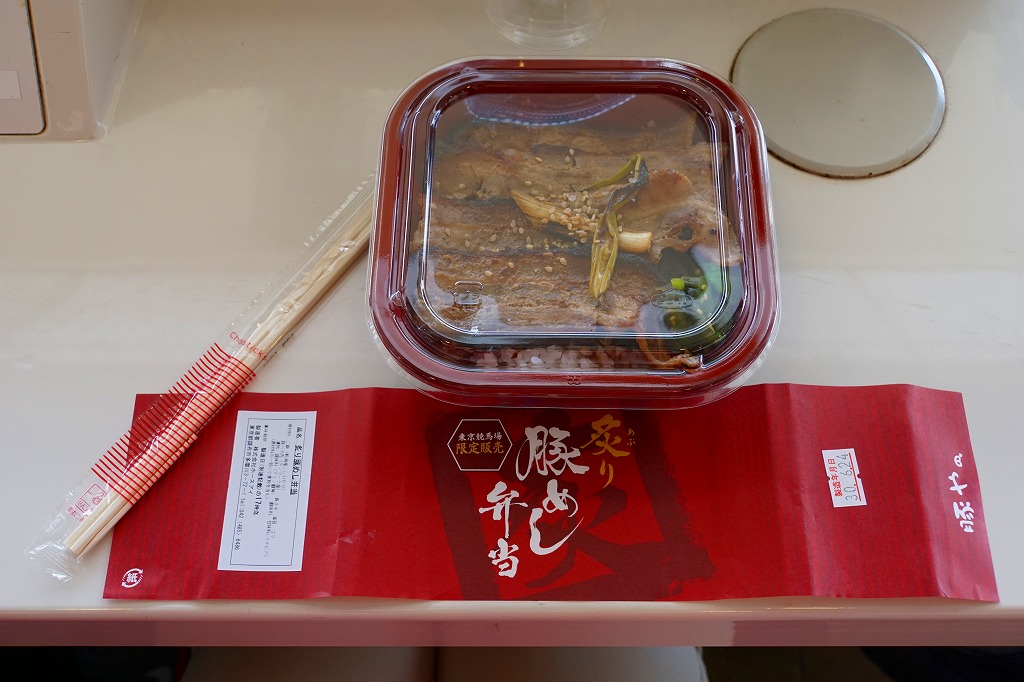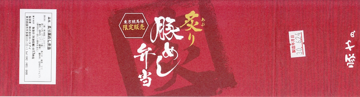 2018(平成30)年の東京競馬場で買えた弁当。観戦スタンド内の売店をくまなく巡ったつもりが、掛紙があるもの、駅弁のようなものは、これだけであった。小柄なプラ容器に白飯を詰め、カリカリに焼いた豚バラ肉で覆い、ネギや漬物を添える、見た目には重そうな軽食。例えば「トン勝つ」のようなゲン担ぎは見当たらない。調製元の名称は場内の売店と同じで、所在地や連絡先との関連は不明。