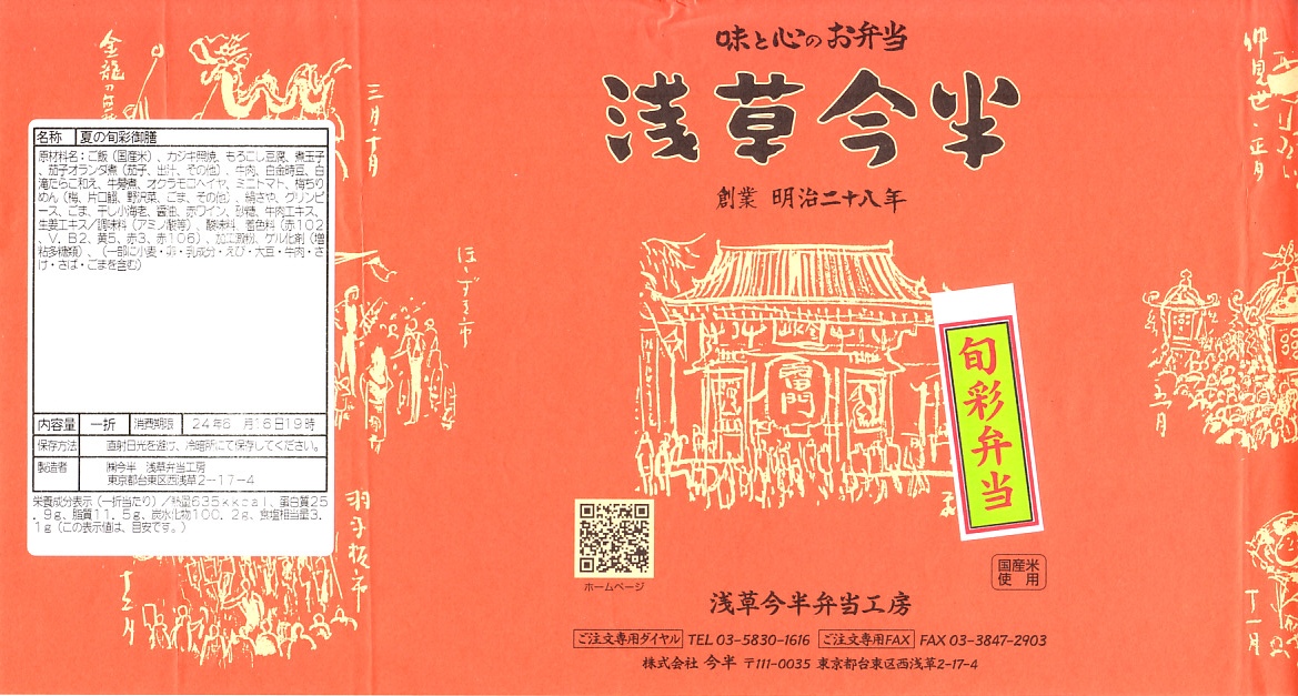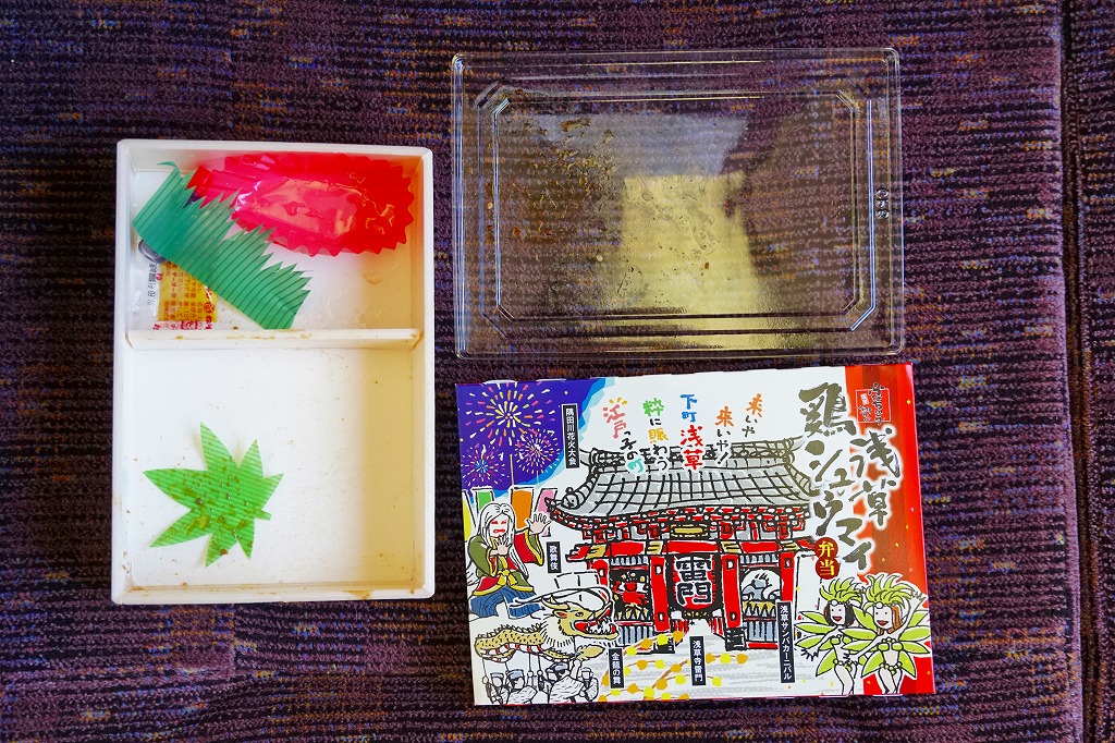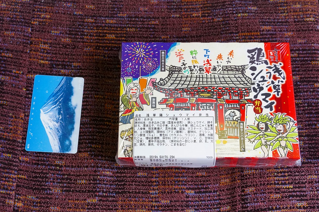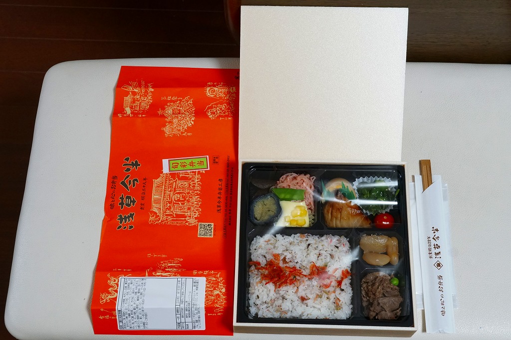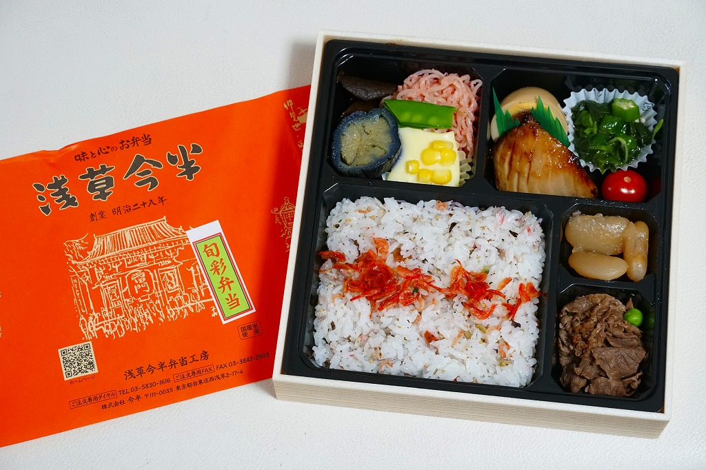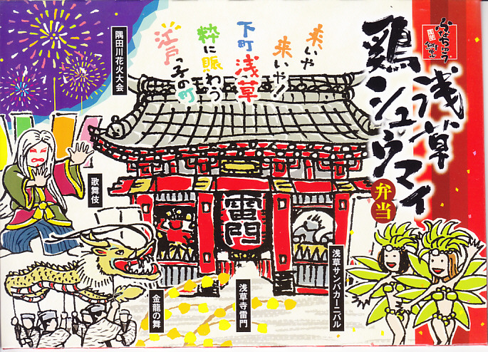 1963(昭和38)年の発売というが、浅草駅の駅弁売店に来たのは少なくとも2011(平成23)年以降、この名前や見栄えになったのは調製元のツイッターの情報によると2018(平成30)年3月からと思われる。ふたには浅草雷門や浅草の観光イベントが賑やかに描かれる。中身は茶飯を鶏そぼろときんぴらごぼうとごま昆布佃煮で覆い、チキンシュウマイ3個、玉子焼、タケノコとニンジンとコンニャクの煮物を添えるもの。飯も焼売もおかずも、JR駅の駅弁よりも水気があり柔らかくなっている。2022年1月に浅草駅と北千住駅の駅弁販売店が閉店し、すべての駅弁が終売となった。