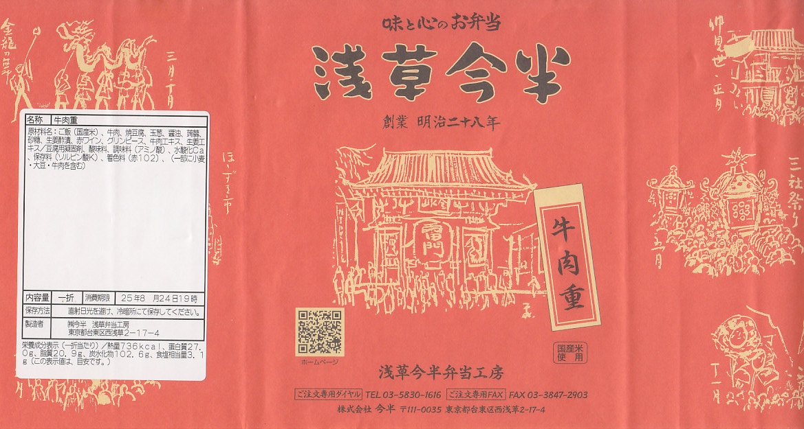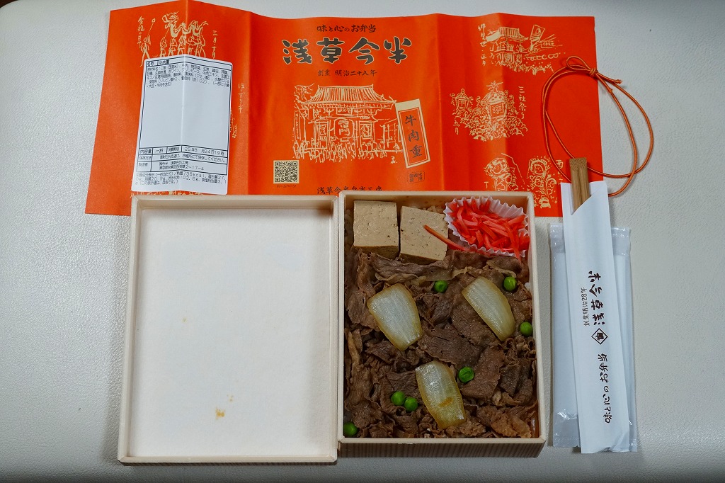 東京都心を中心に、日本中のデパートの食品売り場で売られる、浅草今半の牛肉弁当。東京駅や上野駅や羽田空港でも買え、浅草でも本店に加えて東武鉄道の浅草駅舎である松屋浅草店で購入できるが、2023年までに東武浅草駅の駅弁売店でも売られるようになった。浅草駅で「浅草今半」なので、浅草駅の駅弁に見えてくる。