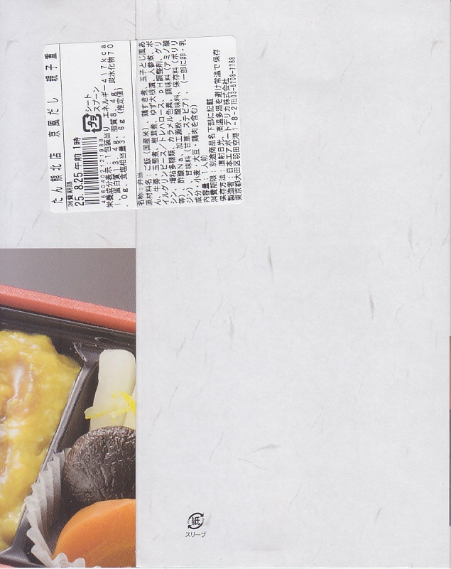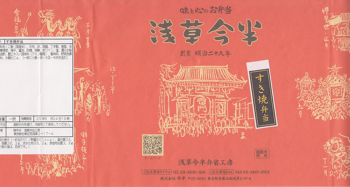 各種の商品で共通の掛紙に、これは「すき焼弁当」のシールを貼る。正方形の発泡材容器の、半分は日の丸御飯、半分はおかずで、牛肉煮と丁字麩と青梗菜、こんにゃくとタマネギとシイタケの煮物に煮玉子。薄手の牛肉の柔らかさと割り下が絶品な、見るからに高級な牛肉弁当。