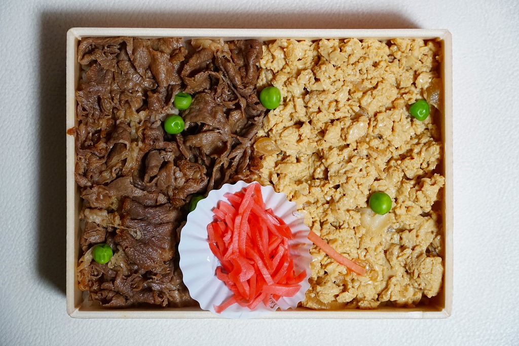 各種の商品で共通の掛紙に、これは「牛玉重」のシールを貼る。長方形の発泡材容器に、割り下が浸みた御飯を敷き、牛肉煮と煮た玉子で覆い、グリーンピースと紅生姜で彩る。牛肉と玉子にも、甘さと辛さが絶妙な秘伝の割り下の味が浸み、常温の作り置きでもおいしさが香るか、あるいは変化に乏しく飽きが来るか。人気ブランドのおいしい牛丼。